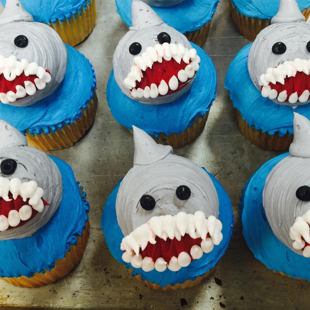 A cupcake topped with a buttercream piped shark.