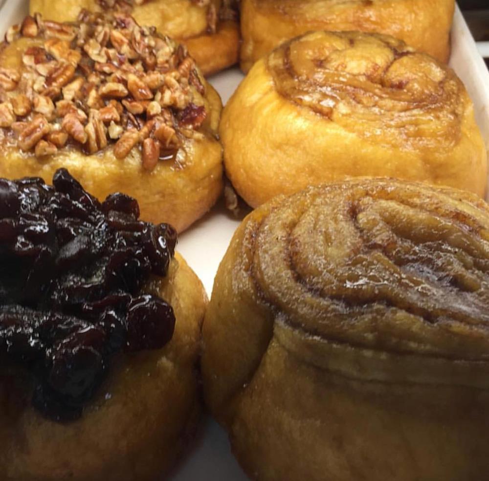 Dozen assorted large sticky buns with various toppings, including: pecan, walnut, raisin, and plain.