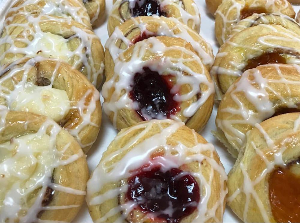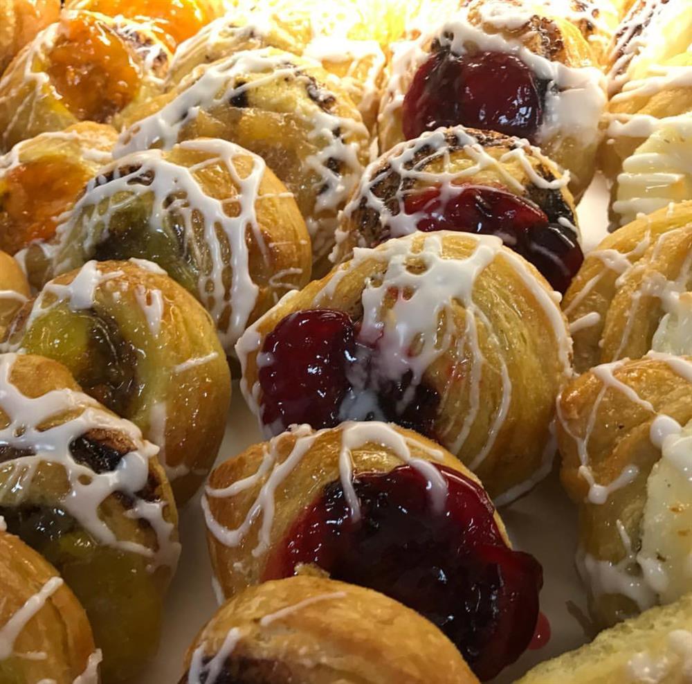 Dozen assorted mini danish with various fruit fillings. An assortment of our 8 flavors, including: cherry, raspberry, blueberry, cream cheese, pineapple, lemon, apple, and apricot.