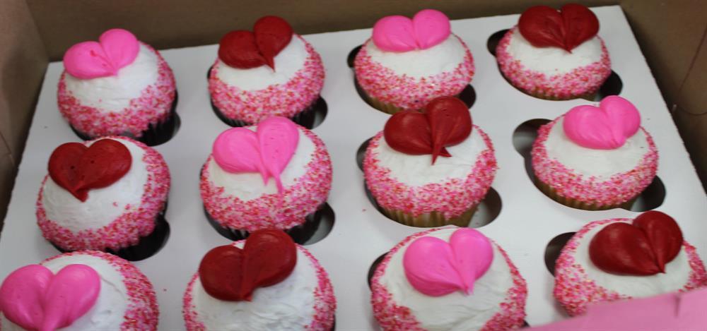 A dozen heart decorated cupcakes. Available chocolate or yellow cupcakes with buttercream icing and decorated with piped hearts.