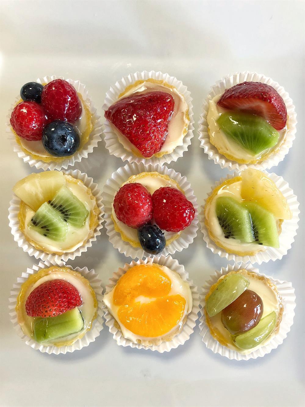 Mini tart shells, filled with french custard, topped with assorted fresh fruits, and covered in a sweet apricot glaze. Bite-size version of our signature fruit flan, perfect for parties!