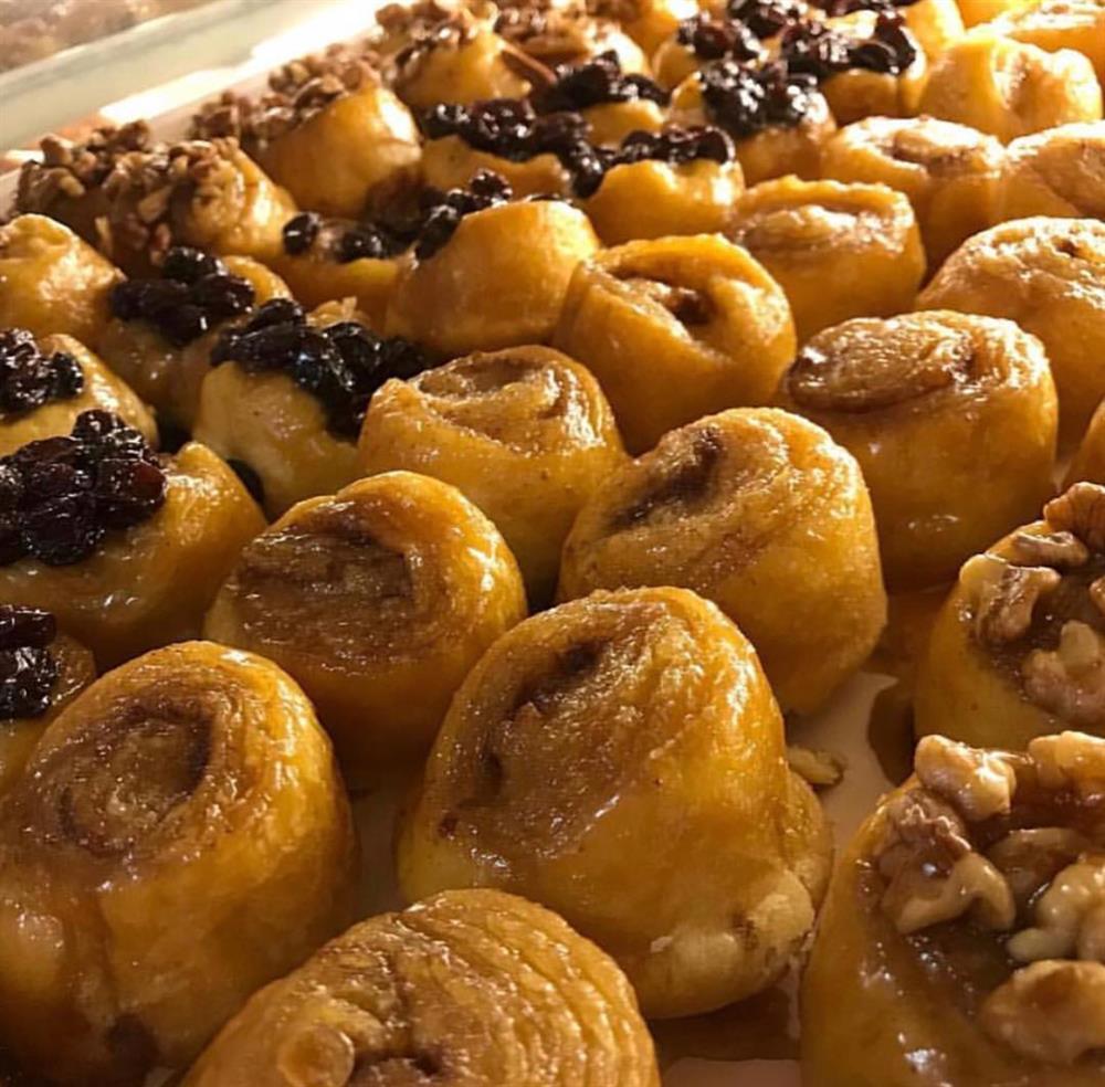 A dozen assorted of our mini size delicious honey bun containing brown sugar and cinnamon, and coated with sticky smear. Includes plain, raisin, walnut, and pecan toppings.