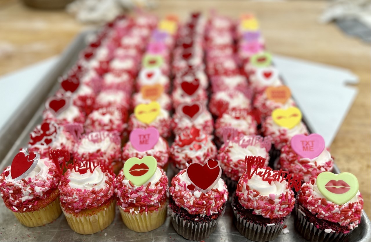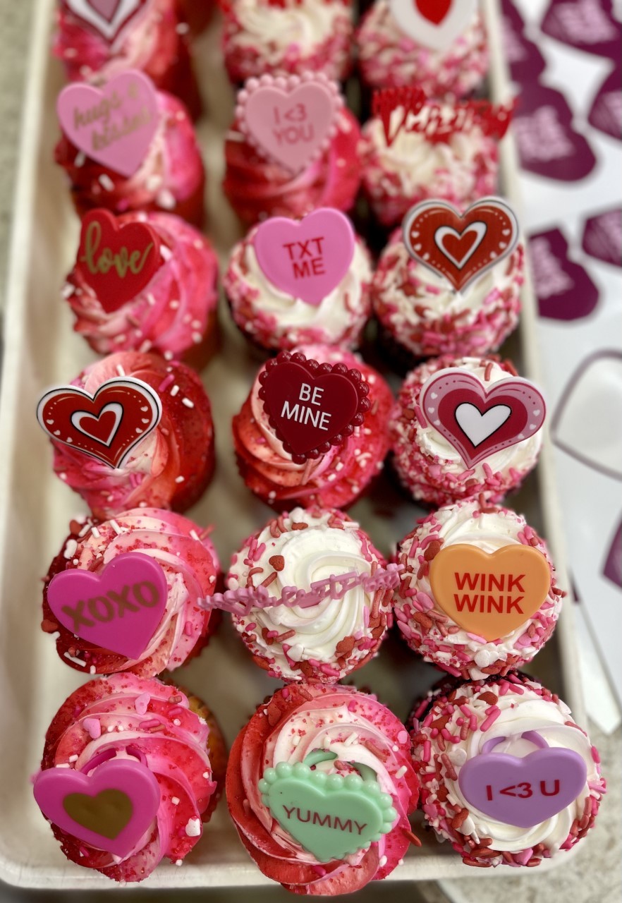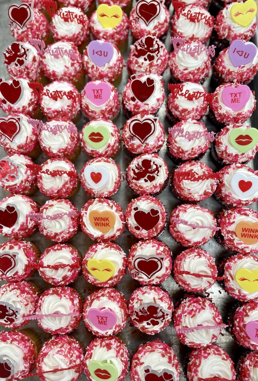 A dozen Valentine's swirl cupcakes. Available chocolate or yellow cupcakes with buttercream icing and decorated with a plastic Valentine's ring. Please specify flavor in comments. Default is half chocolate and half vanilla cake.