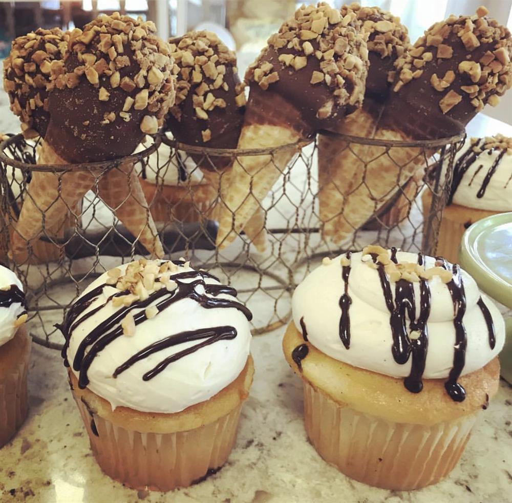 A vanilla bean cupcake topped with a swirl of vanilla bean french buttercream, covered in chocolate, and garnished with chopped peanuts. An ode to one of our favorite summer ice cream treats!