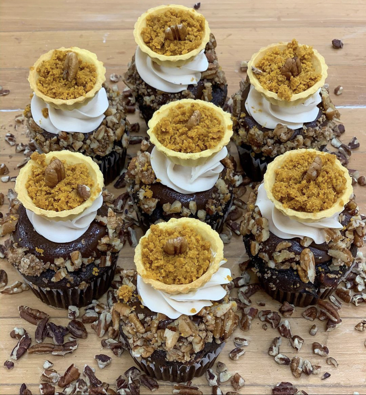 A chocolate cupcake filled with dulce de leech caramel icing, topped with a swirl of fudge & caramel buttercream, & garnished with chopped pecans & a mini pecan pie.