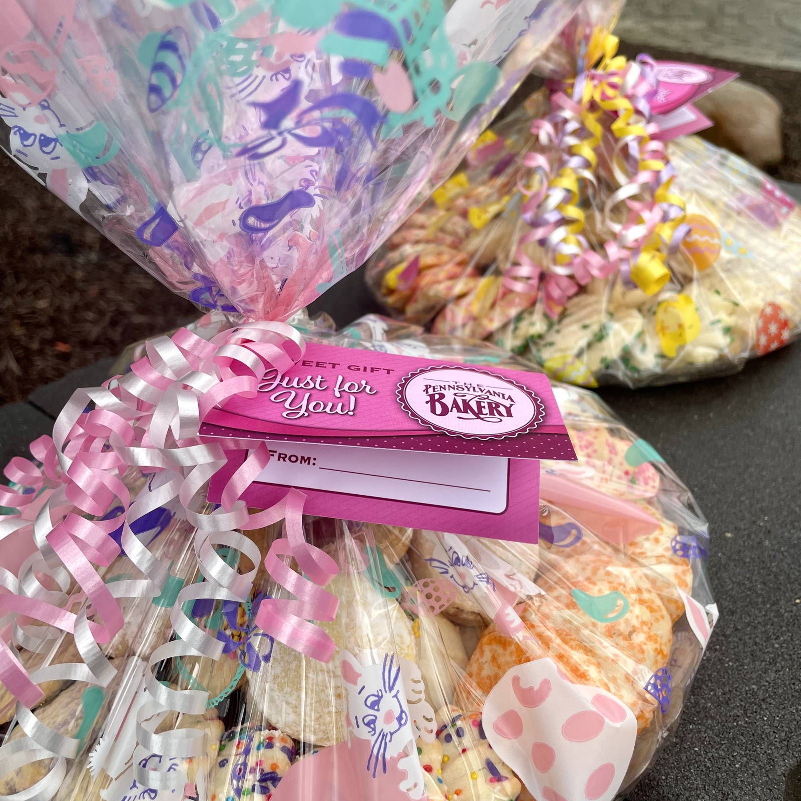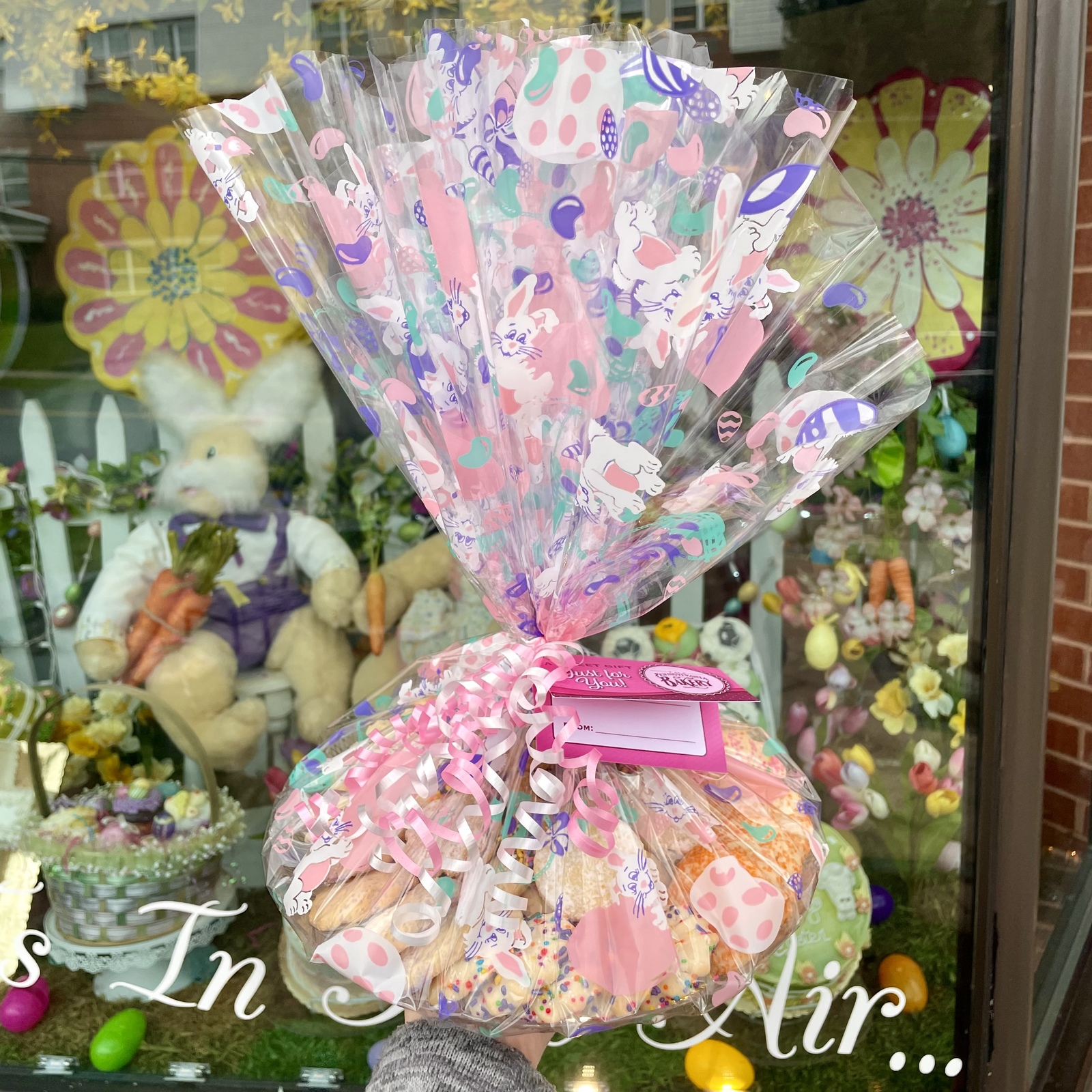 1.5 LB's of our assorted butter tea cookies on a clear tray and wrapped with spring cellophane wrap and ribbons. A perfect hostess gift or addition to any party.