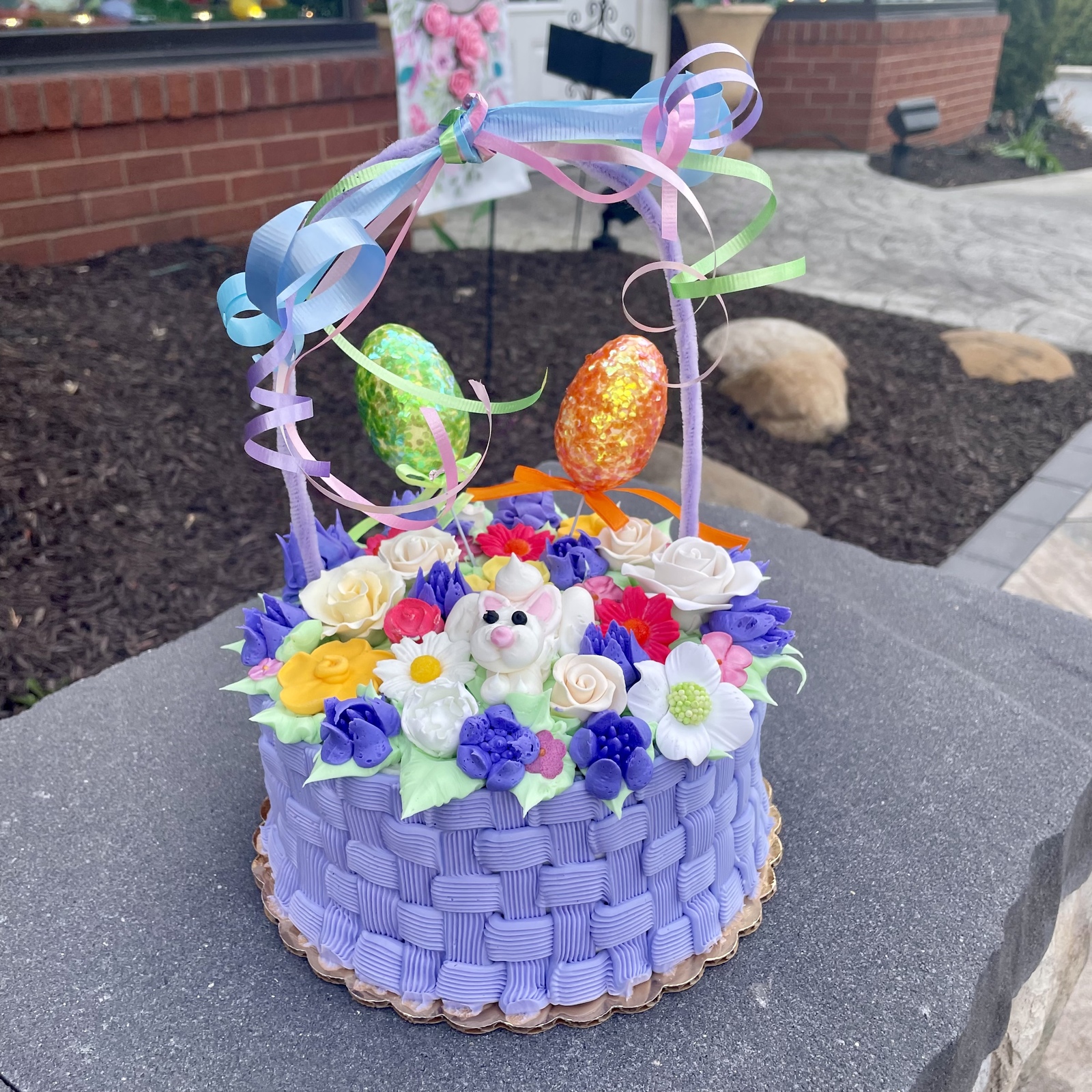 A beautiful 7 inch cake (serves 6-8) decorated to look like an Easter basket. Please specify cake flavor: yellow, chocolate, marble, or 1/2 and 1/2 (layer of each).
