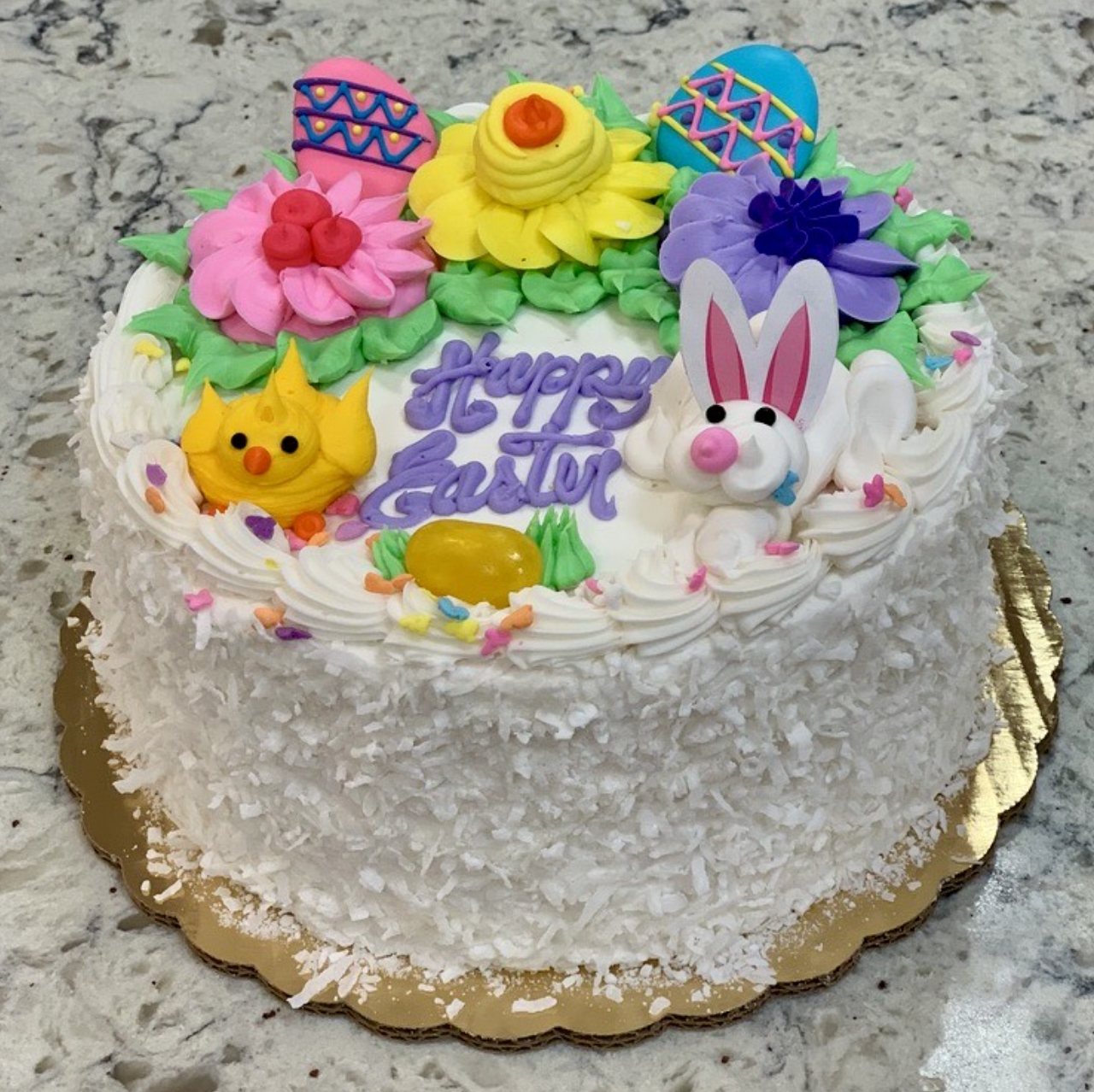 An 8 inch (serves 8-10) yellow cake with coconut buttercream and garnished with Easter decorations.