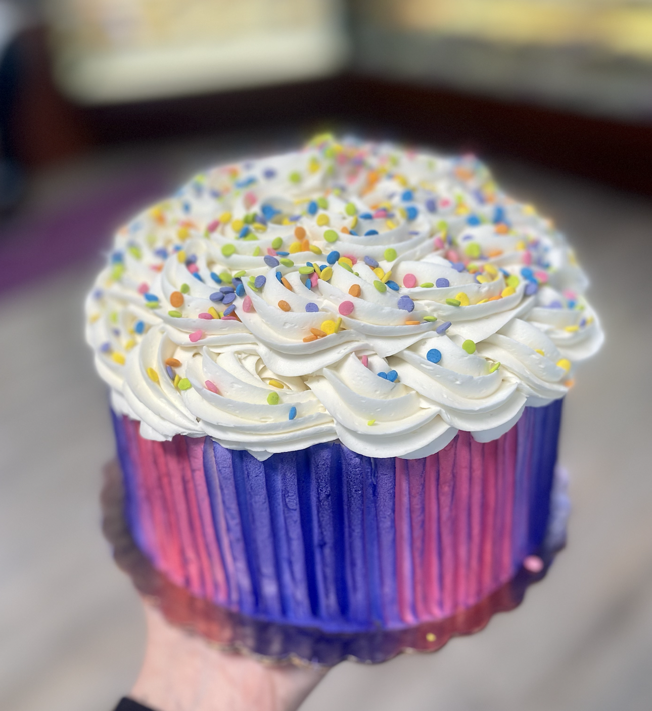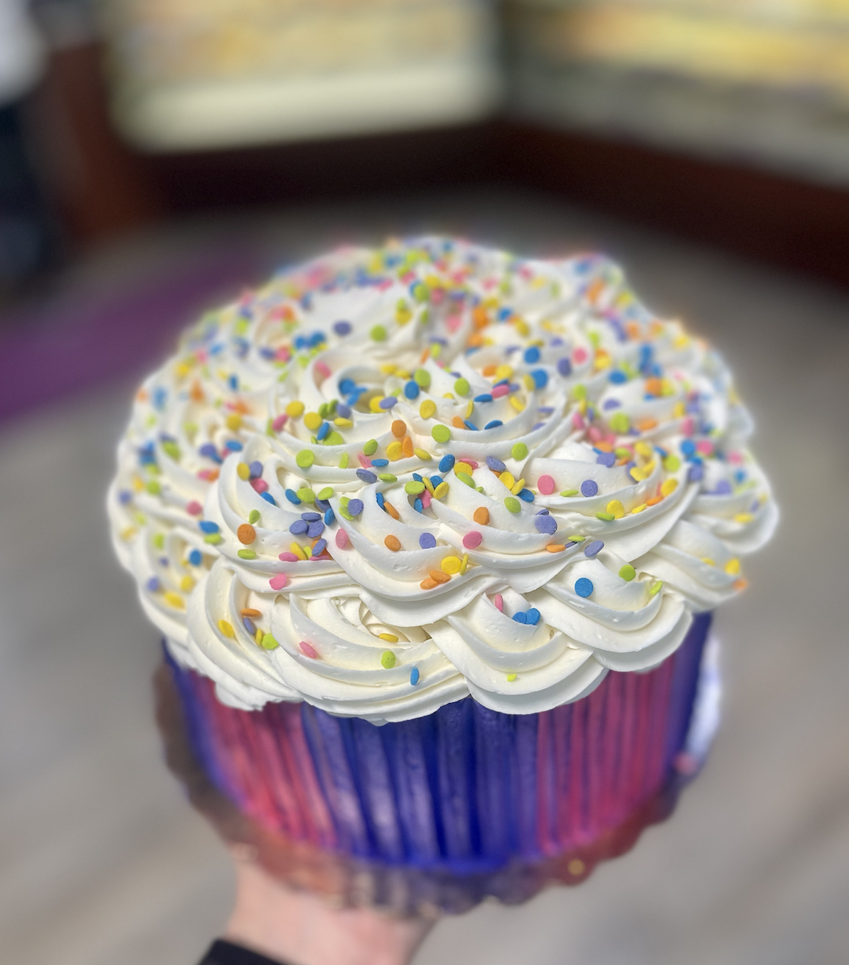 A 8 inch (serves 8-10) cake decorated to look like a giant cupcake. When ordering, please specify cake flavor (available with yellow, chocolate, or marble cake).