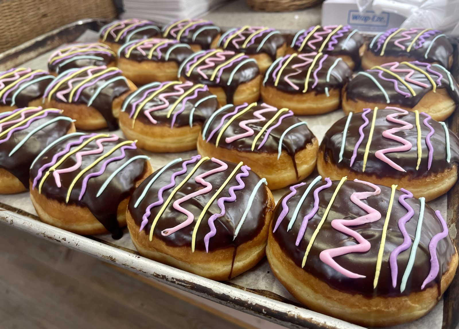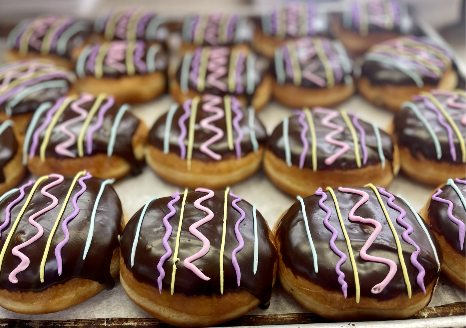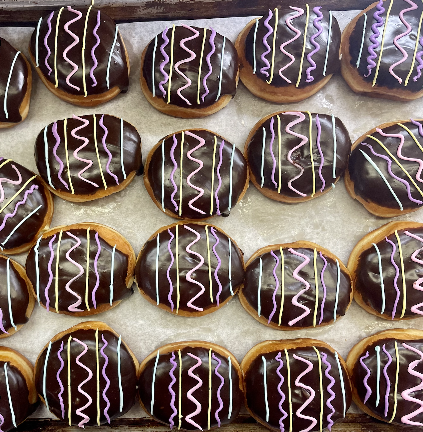 A half dozen of our Boston Cream Easter Egg-shaped Donuts. Filled with vanilla custard, topped with chocolate, sprinkles, and buttercream decorations.