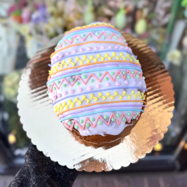 Our delicious hot cross bun (a soft breakfast bun with candied fruits and raisins) in a larger egg shape, glazed and decorated like an easter egg.