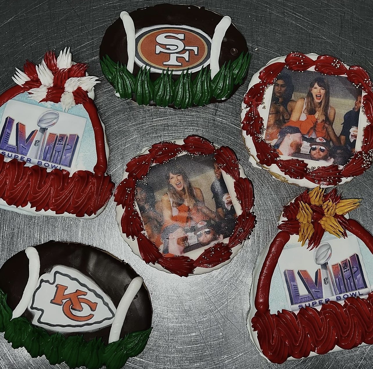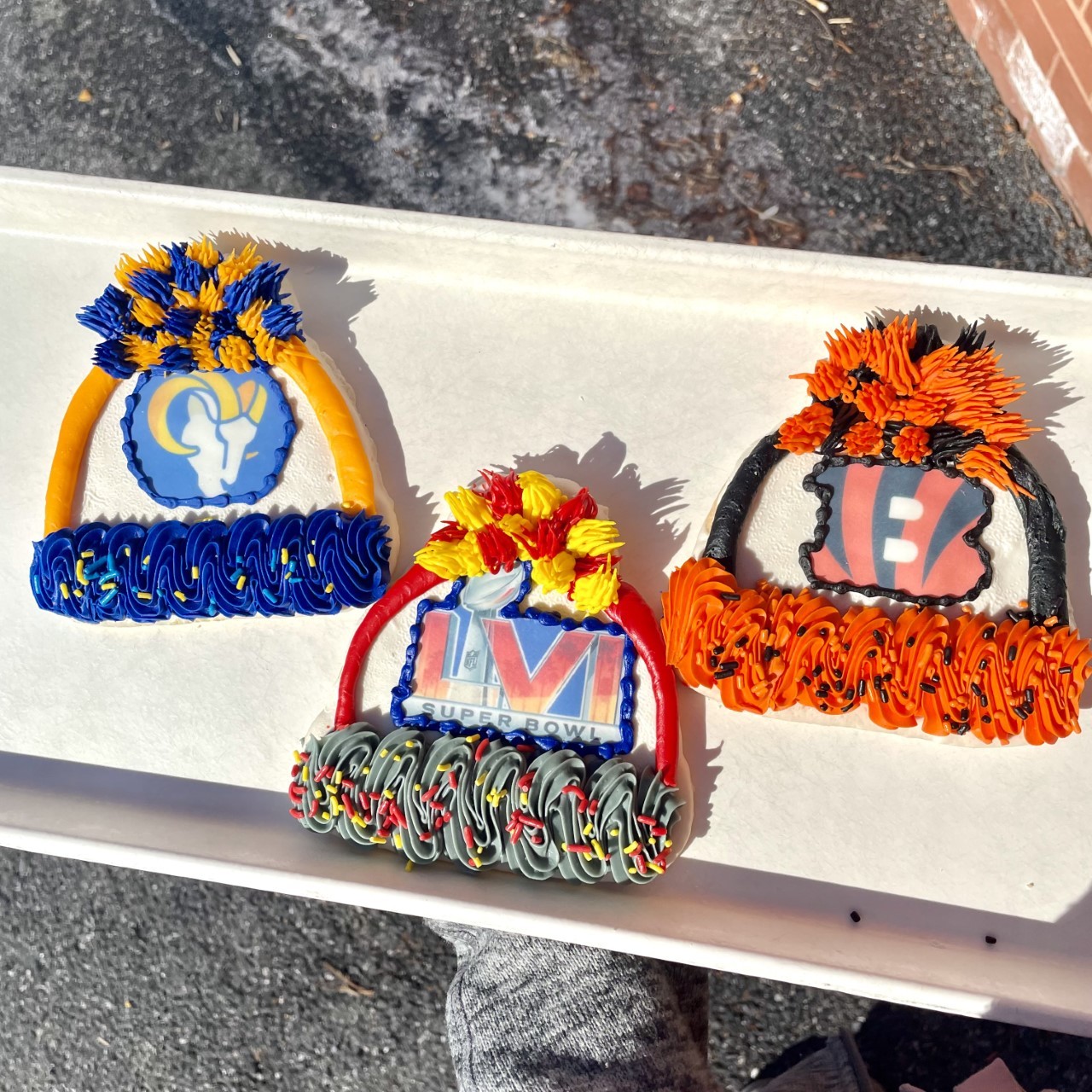 Our beanie-shaped sugar cookie, covered in white chocolate, and hand-decorated to look like a football beanie with superbowl logo and/or edible team logo. Please specify if you want the superbowl logo or which team selection.