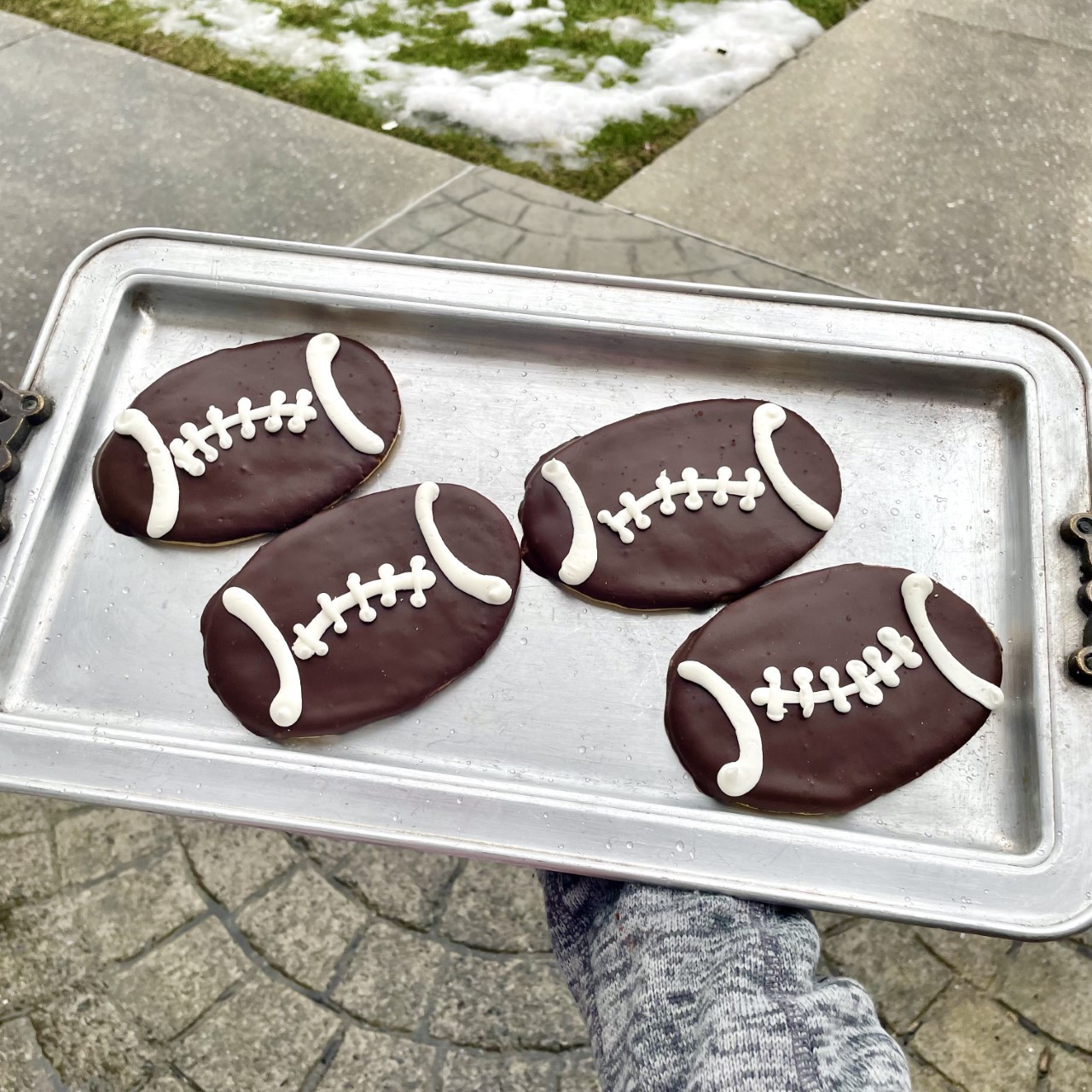 A dozen of our large sugar cookies, topped in chocolate, and decorated to look like a football.