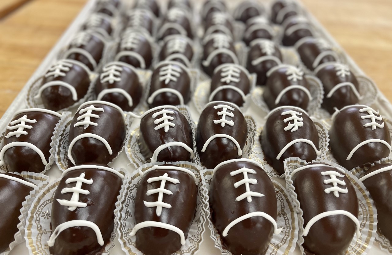 An individual chocolate or vanilla cake, topped with a poured chocolate fudge icing, and decorated to look like a football. Please specify chocolate or vanilla cake in notes when ordering.