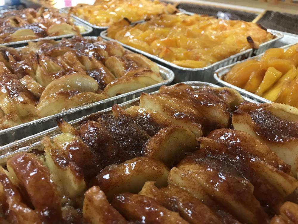 A buttery cobbler base with fresh apple slices and garnished with an apricot glaze. Locally grown apples are used when in season.