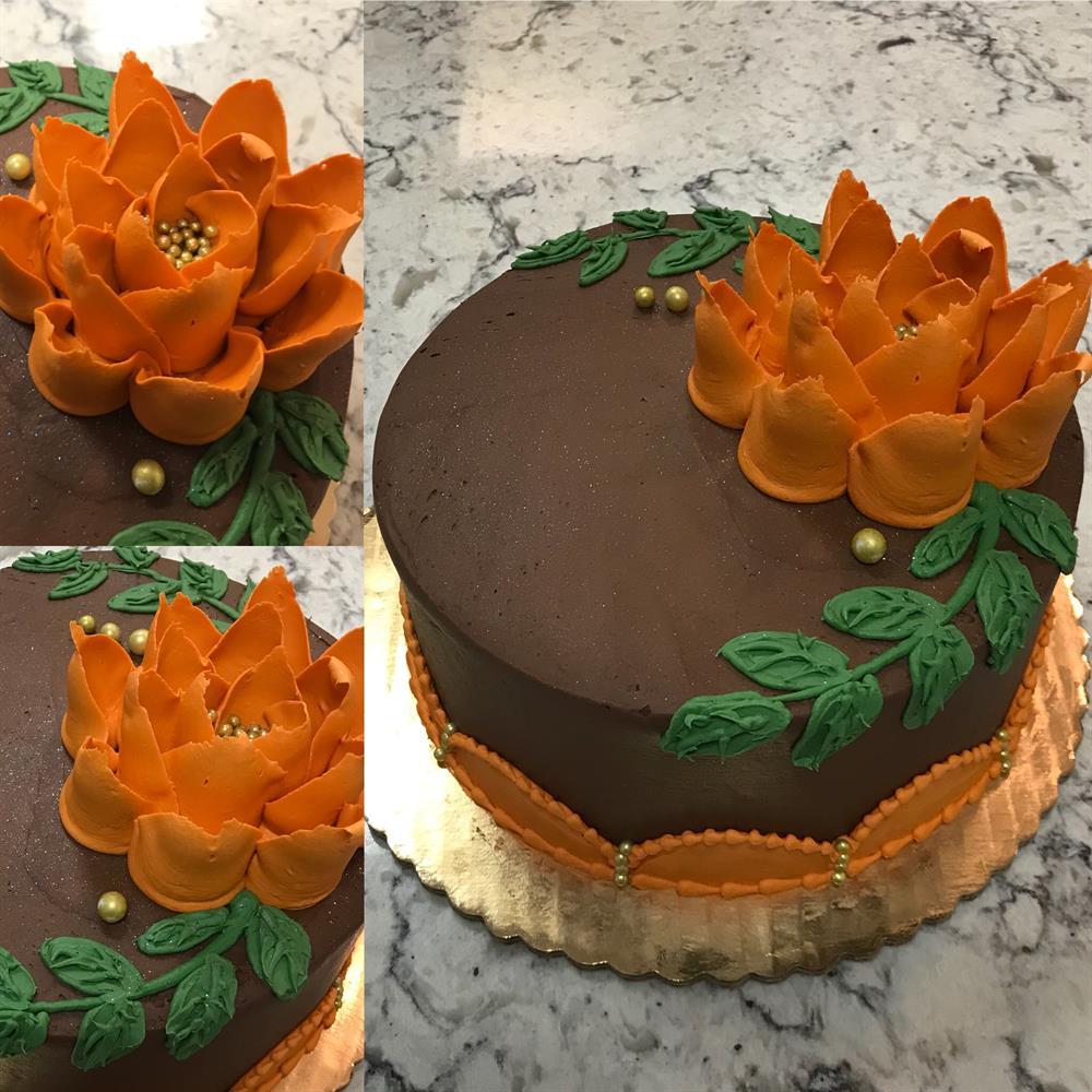 An 8 inch cake, chocolate fudge filled, and iced, hand-decorated with a giant orange fall flower, piping on sides, and edible gold beads. Serves 8-10. When ordering, please specify cake flavor - including: yellow, chocolate, 1/2 and 1/2 (layer of yellow and layer of chocolate), or Marble.