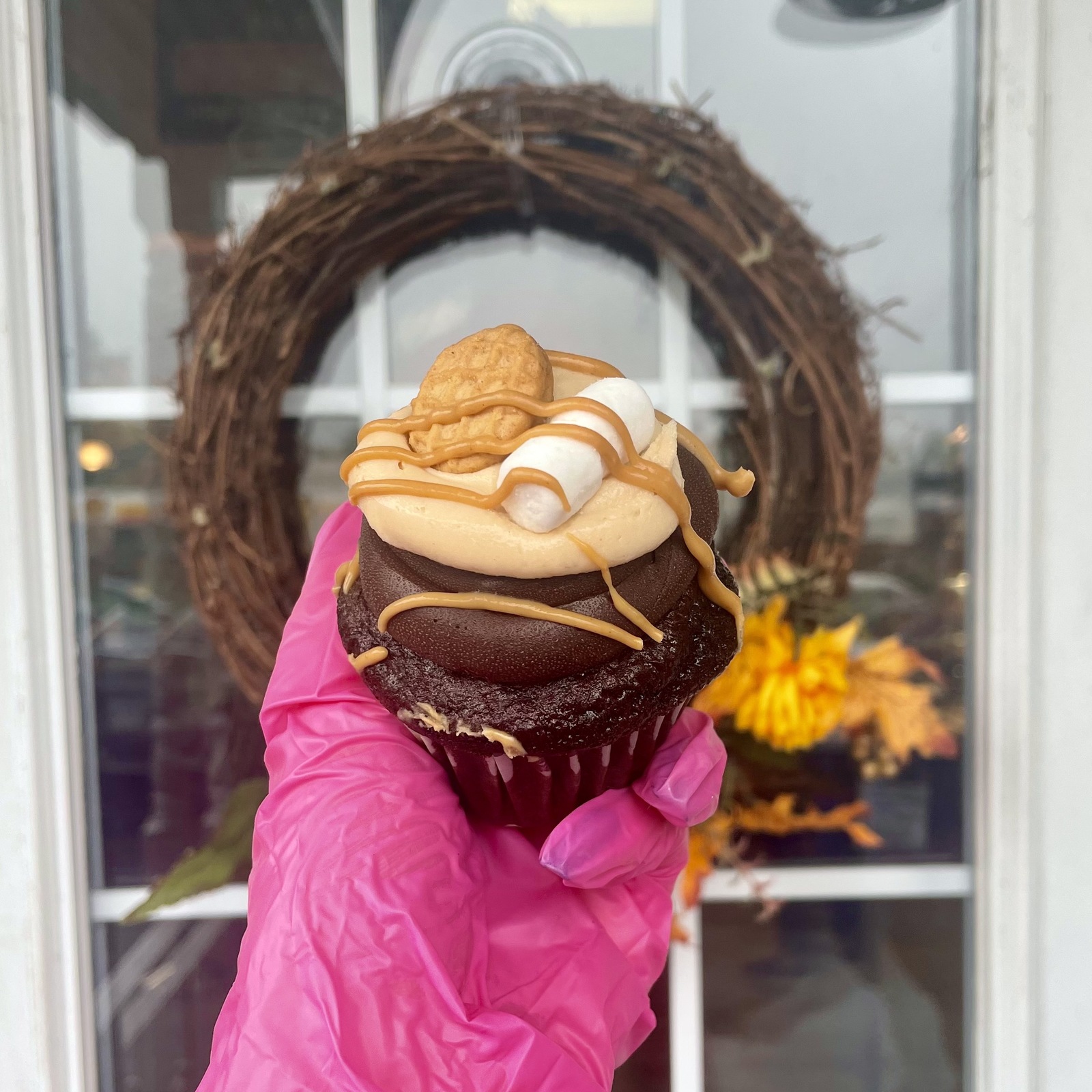 A chocolate cupcake, filled with peanut butter buttercream, topped with a swirl of chocolate fudge & peanut butter buttercream, & garnished with a mini nutter butter, & mini marshmallows.