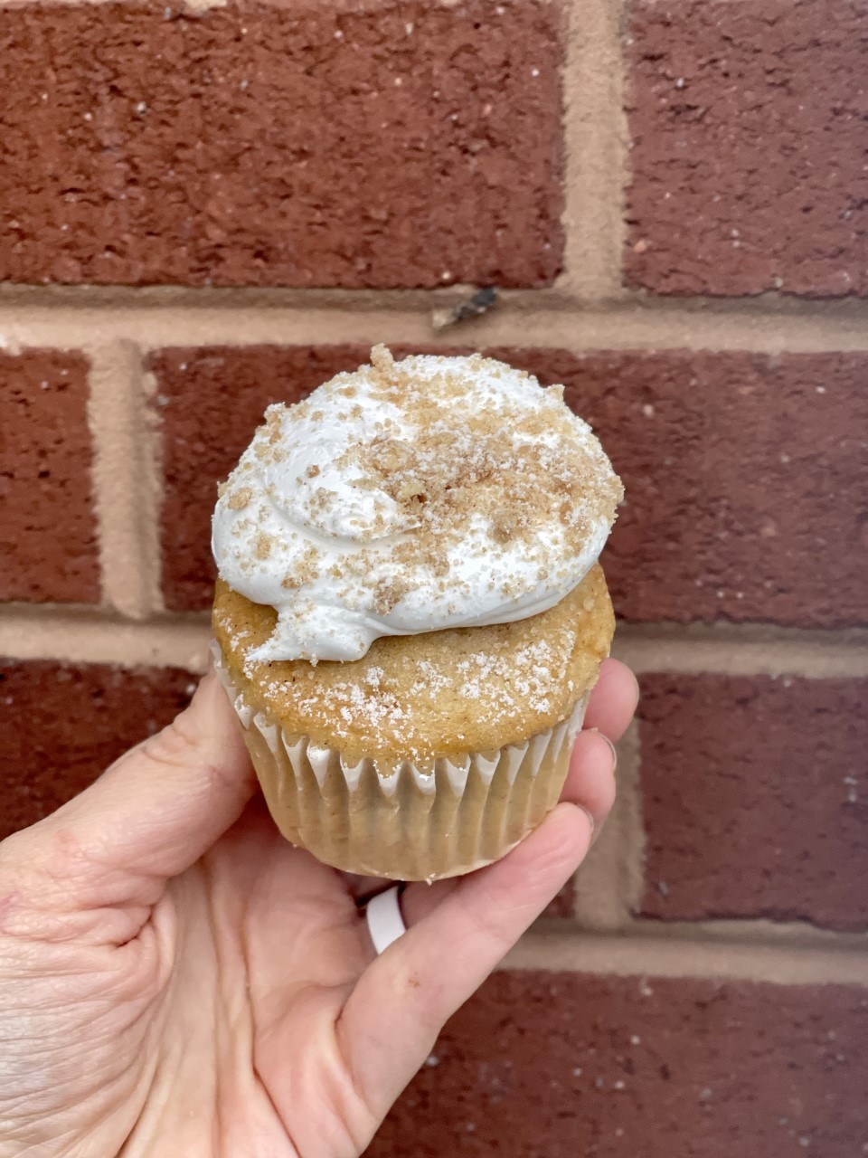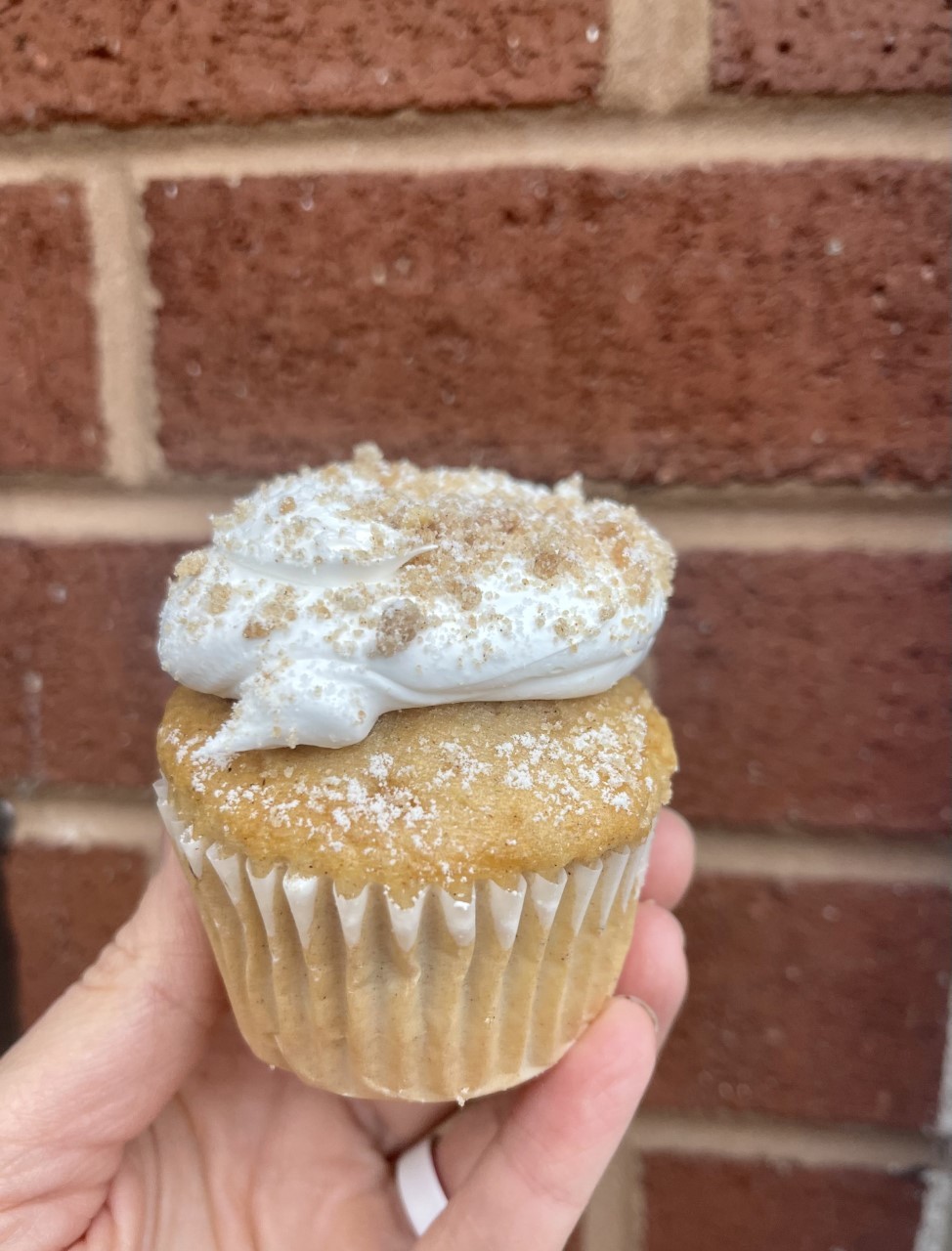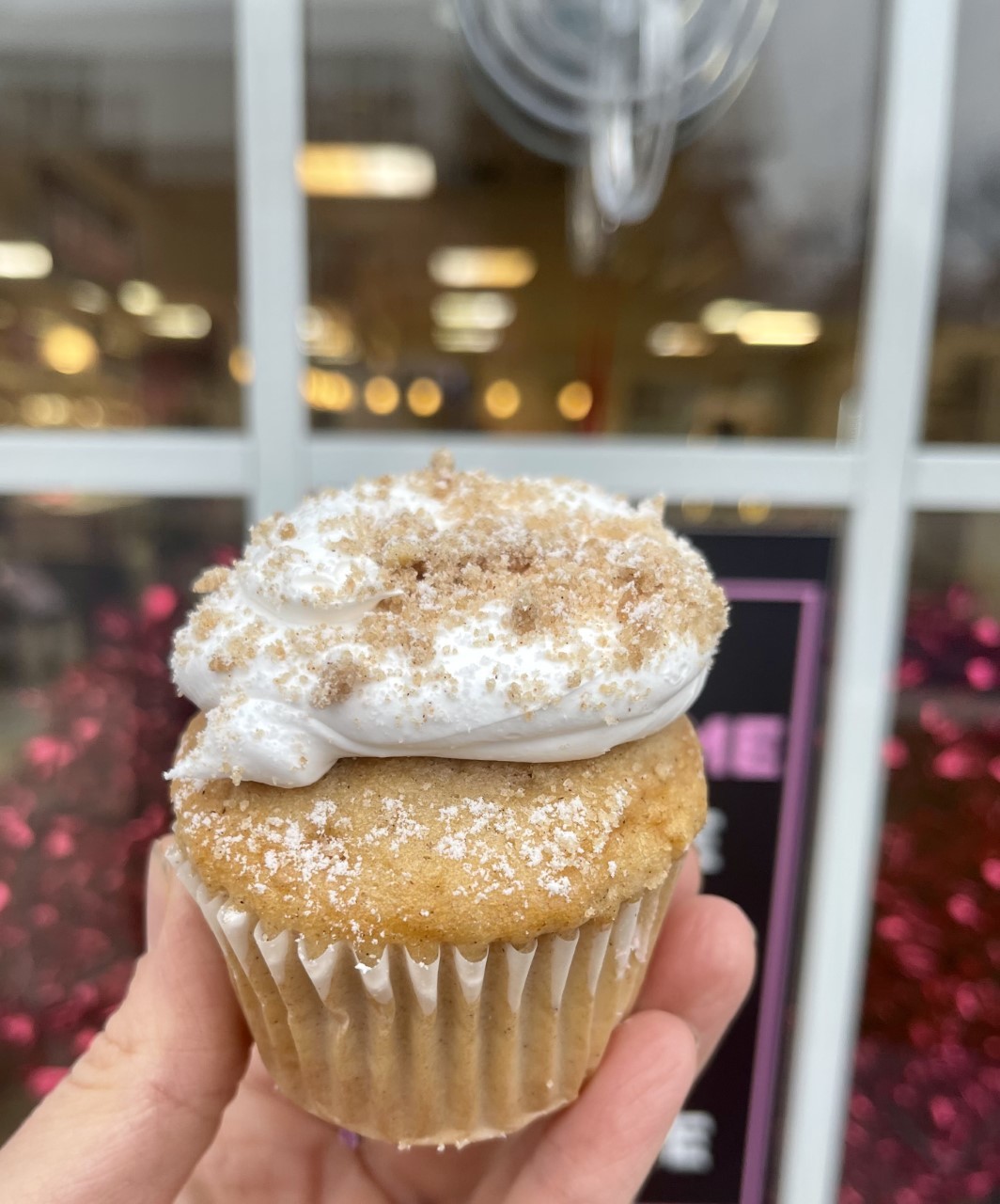 Our delicious sour cream and cinnamon cake topped with a swirl of white mousse, and garnished with real funnel cake pieces and a dusting of powdered sugar.