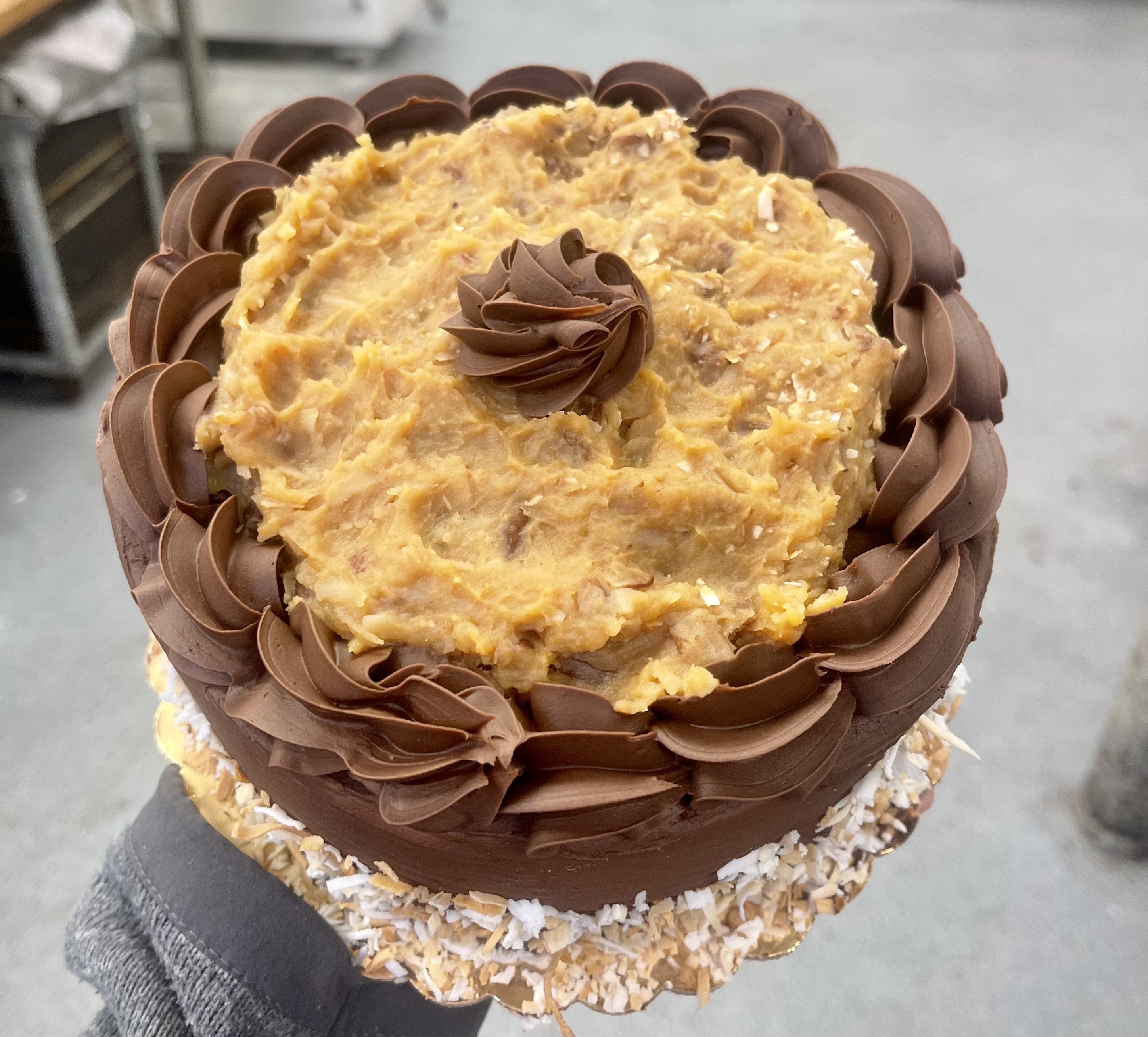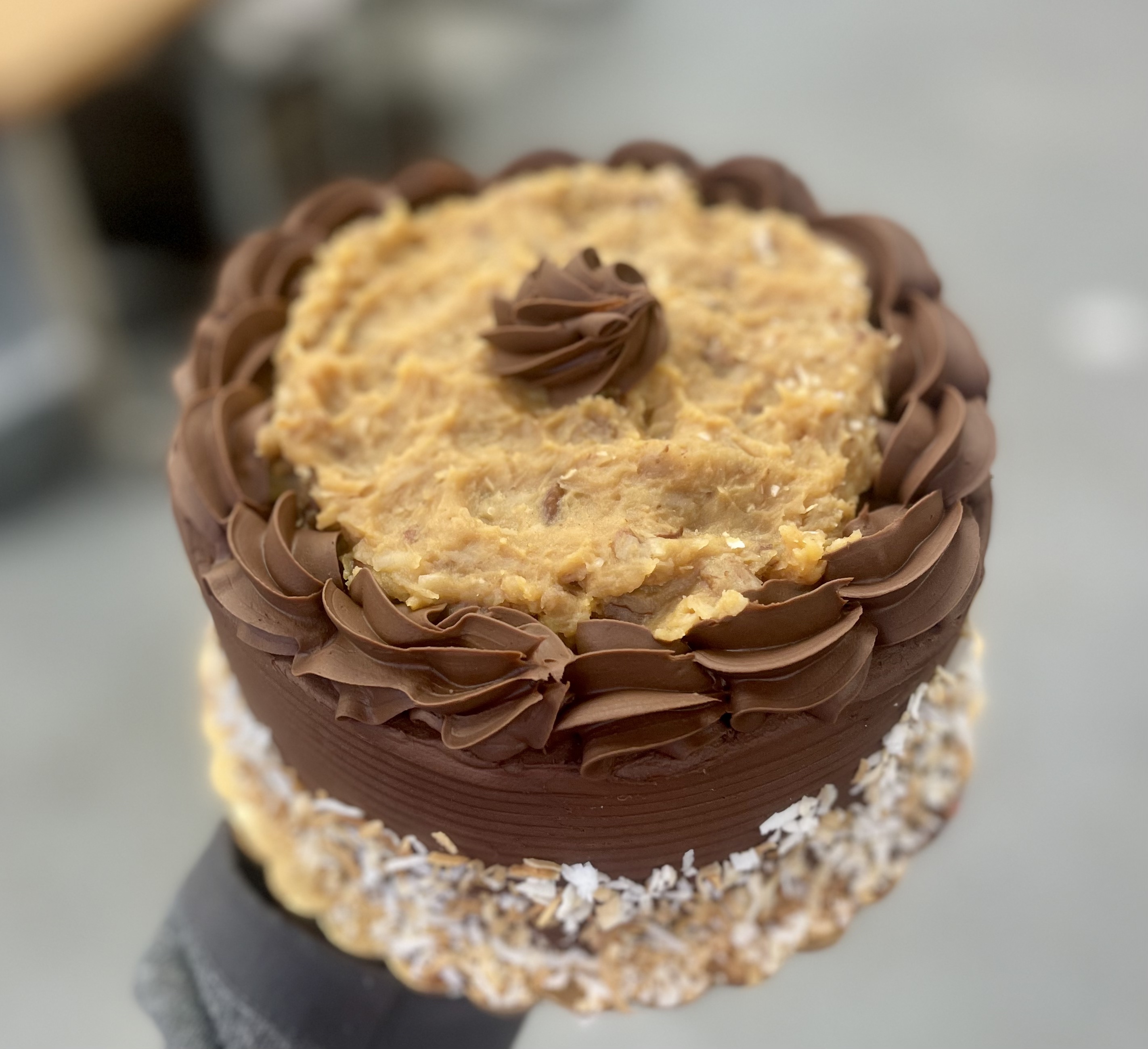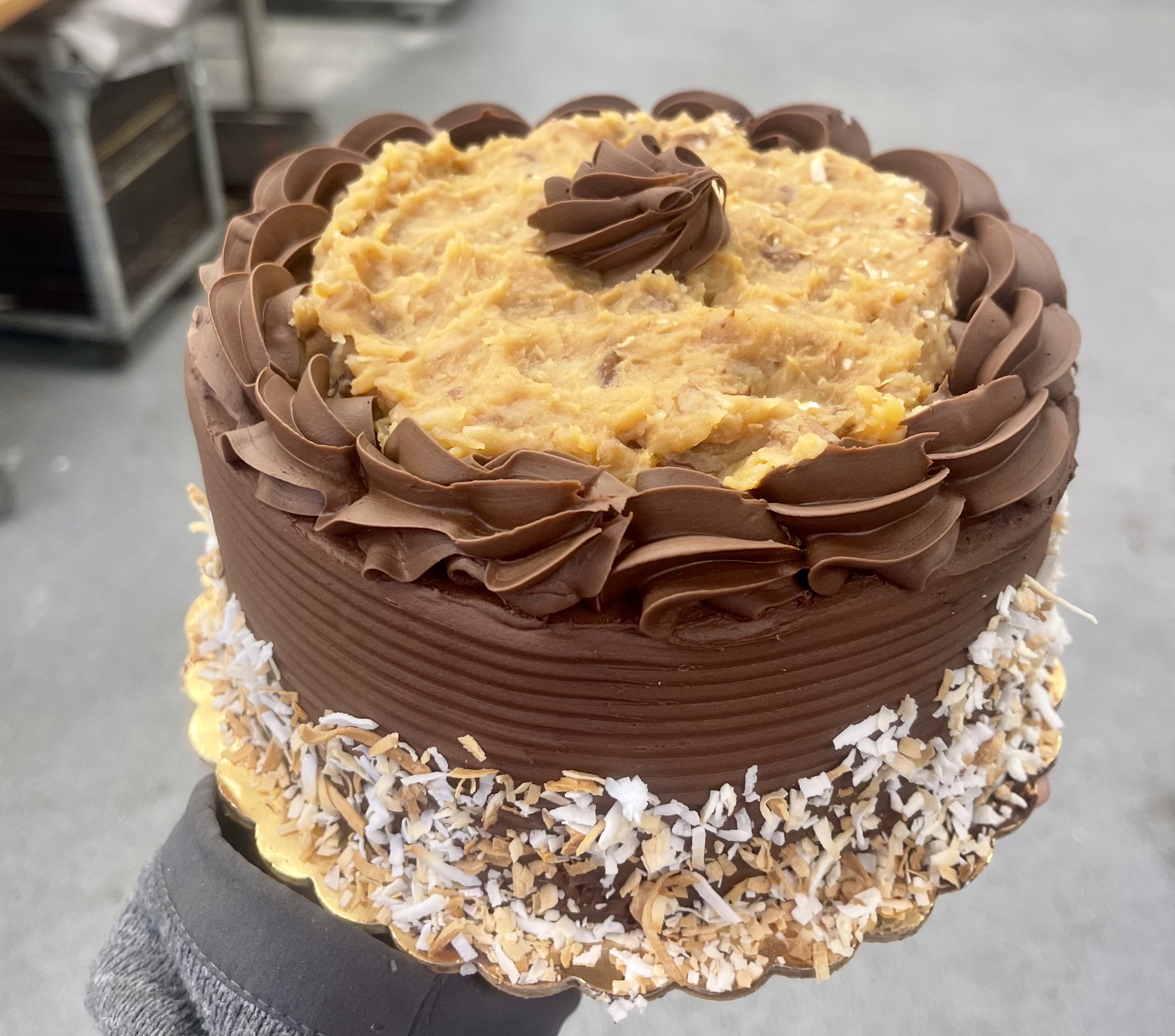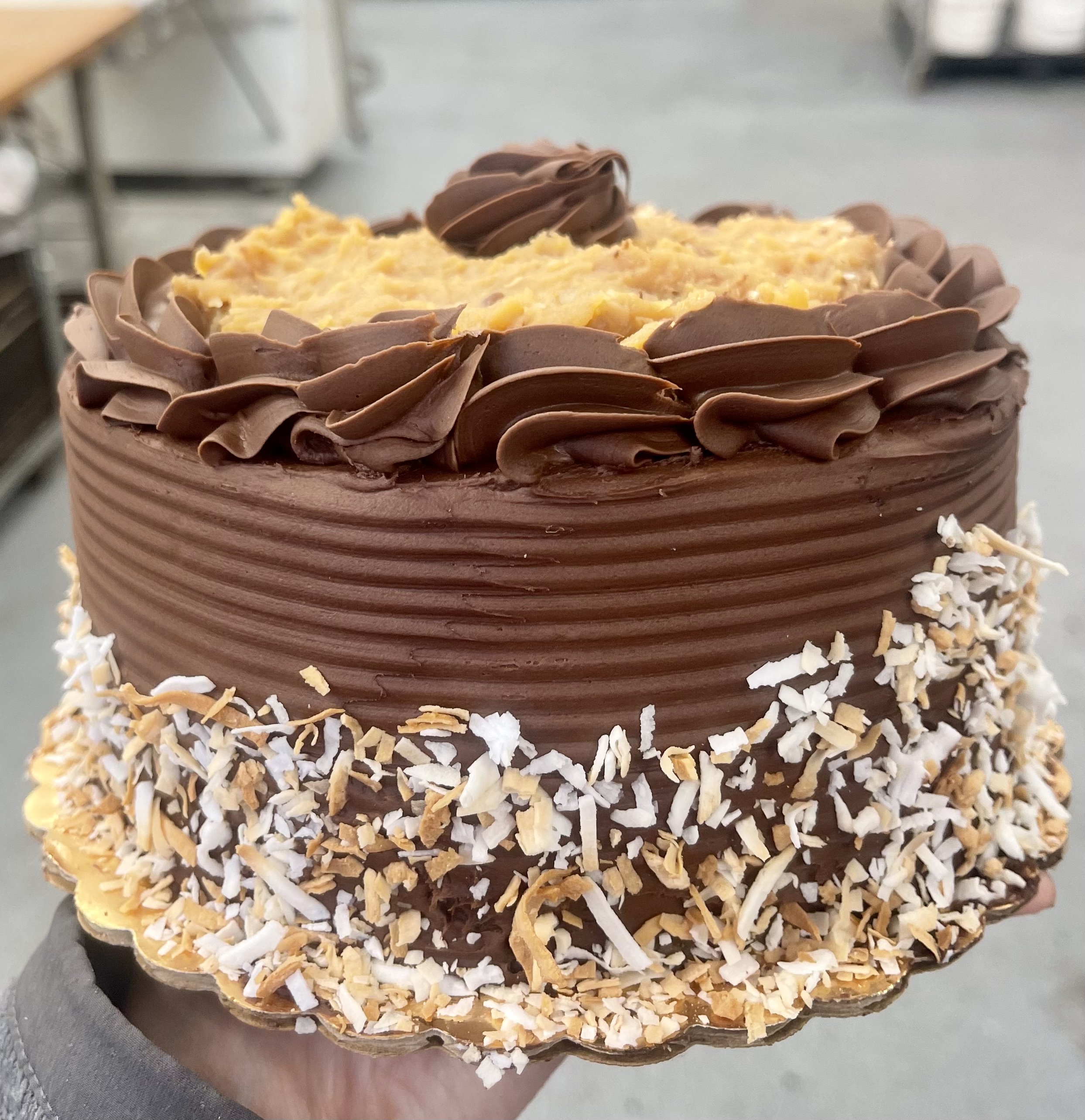 Layers of devils food, filled with German chocolate filling, and iced in our rich chocolate fudge icing, then topped with more of our buttery pecans and coconut German Chocolate filling. Serves 6-8.