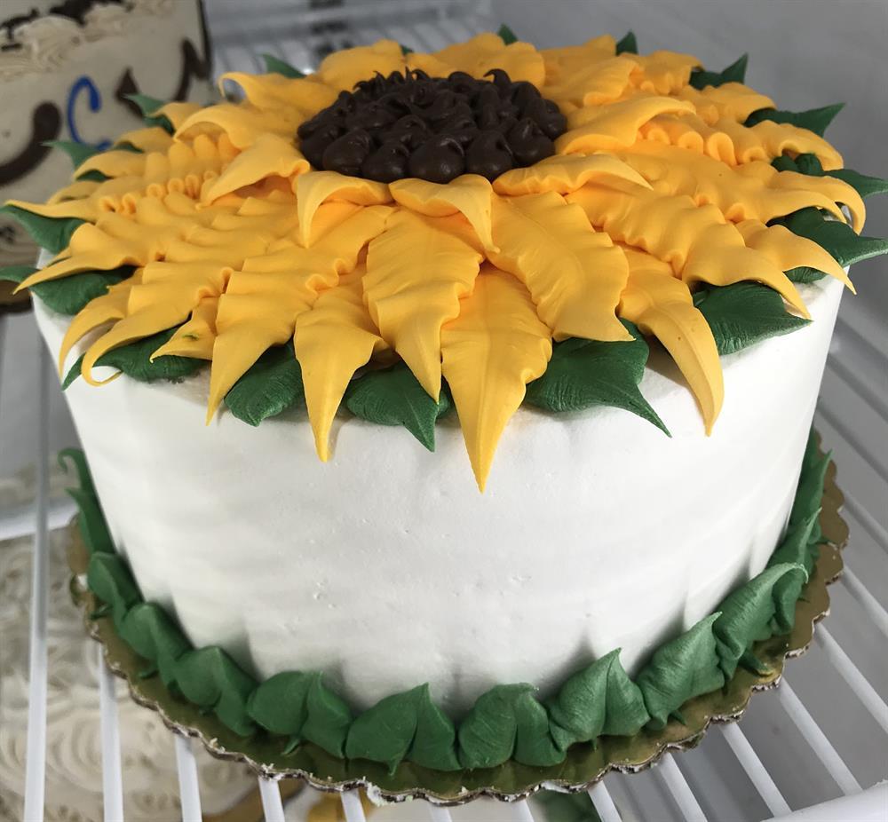 A 7 inch cake, buttercream filled, and hand-decorated with a giant hand-decorated sunflower. Serves 6-8. When ordering, please specify cake flavor - including: yellow, chocolate, 1/2 and 1/2 (layer of yellow and layer of chocolate), or Marble.