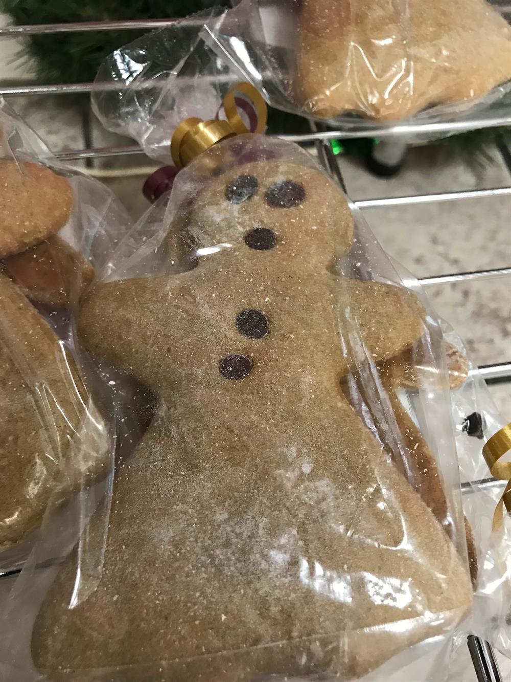 2 of our small gingerbread people (1 boy and 1 girl) with mini chocolate chip eyes and buttons. Sold in a 2-pack, bagged, and ribboned. A perfect stocking stuffer!