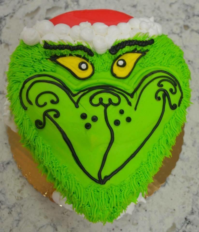 An 8 inch heart-shaped cake (standard flavors available: yellow, chocolate, marble, or 1/2 and 1/2 (layer of each)), iced in buttercream and hand-decorated to look like the Grinch's face. Please indicate cake flavor when ordering.