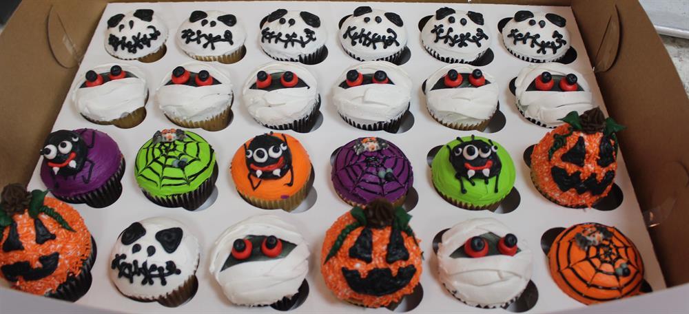 A dozen of our assorted fun hand-decorated Halloween Cupcakes. Available in chocolate or yellow.