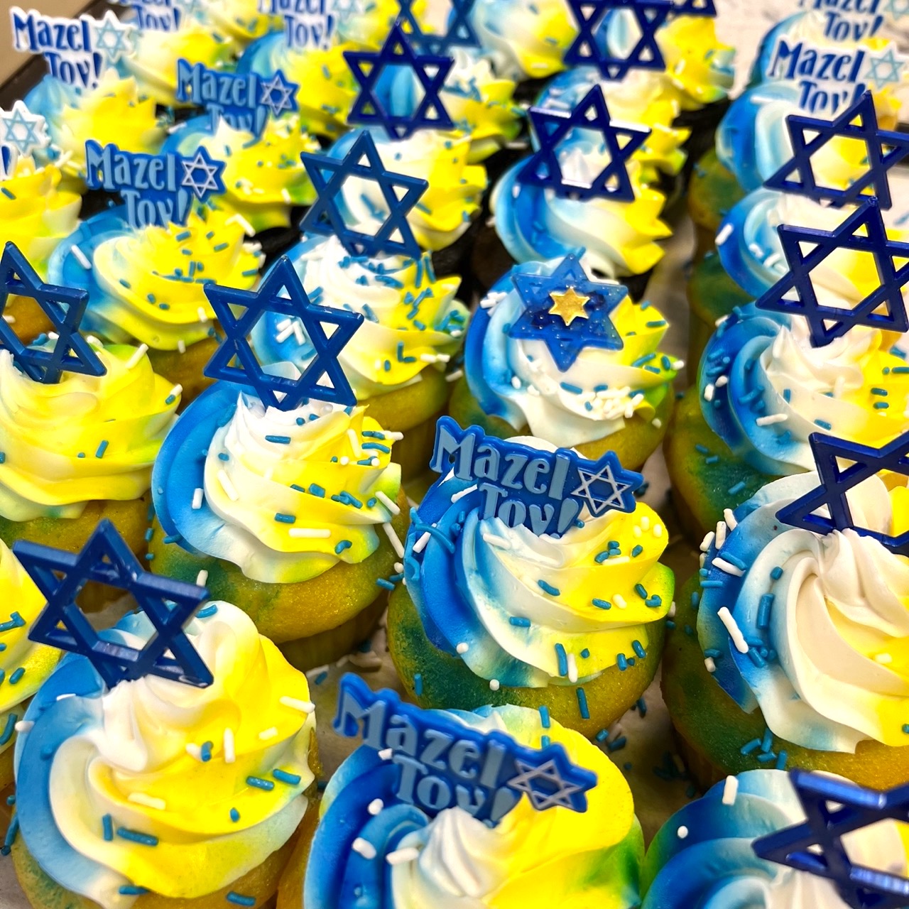 A dozen of our cupcakes (6 chocolate cake and 6 yellow cake), topped with a swirl of buttercream, sprayed with blue and white color, garnished with sprinkles, and Hanukkah decorations.