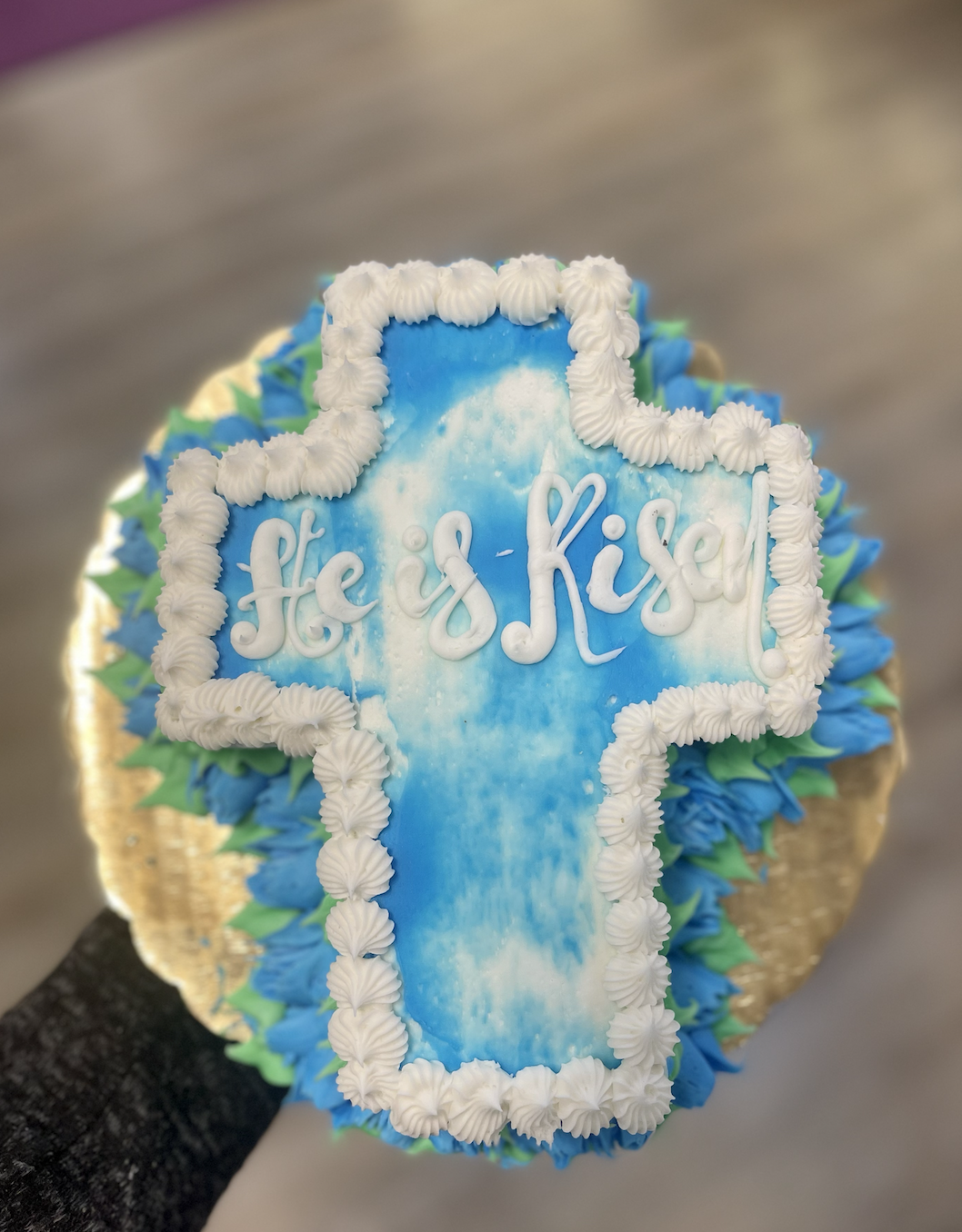 Our 8 inch cross cake (serves 6-8), iced in buttercream icing, and decorated to look like a cross. Please specify cake flavor - yellow, chocolate, marble, or 1/2 and 1/2 (layer of chocolate and yellow).