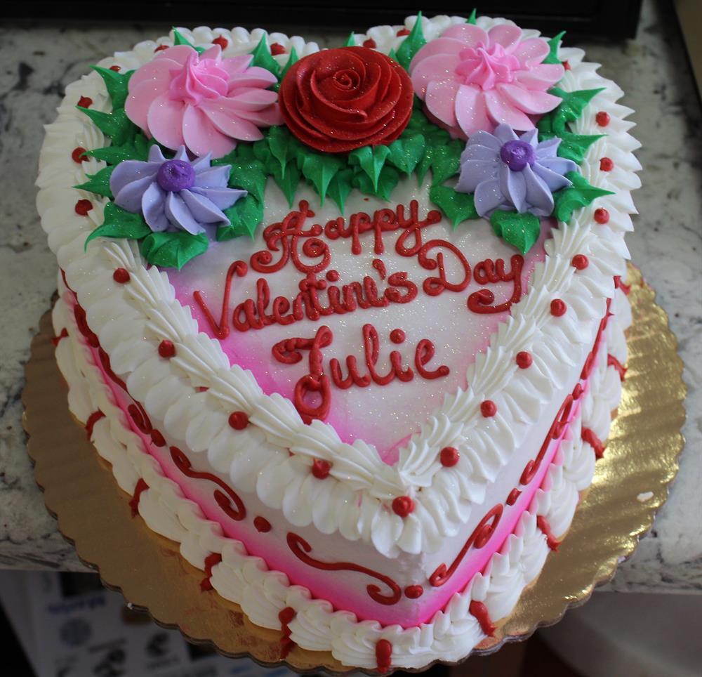 An 8 inch heart-shaped decorated cake, iced with buttercream icing, and decorated with flowers. Please specify inscription and flavor (yellow, chocolate, marble, or 1/2 and 1/2 - layer of each) when ordering. Serves 8-10.