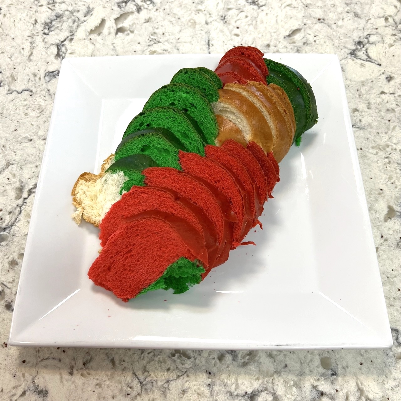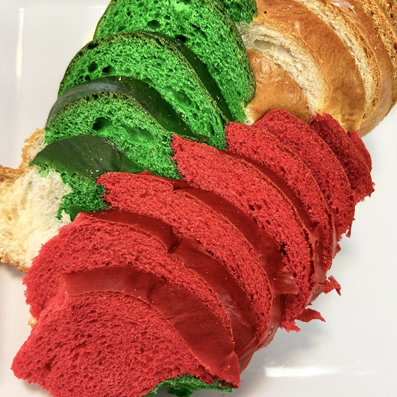 A red and green braided long loaf, which makes a delicious addition to any meal or festive sandwiches. A slightly sweet egg bread.