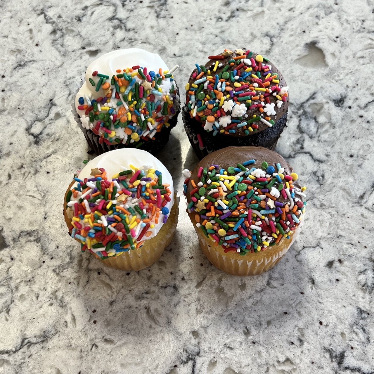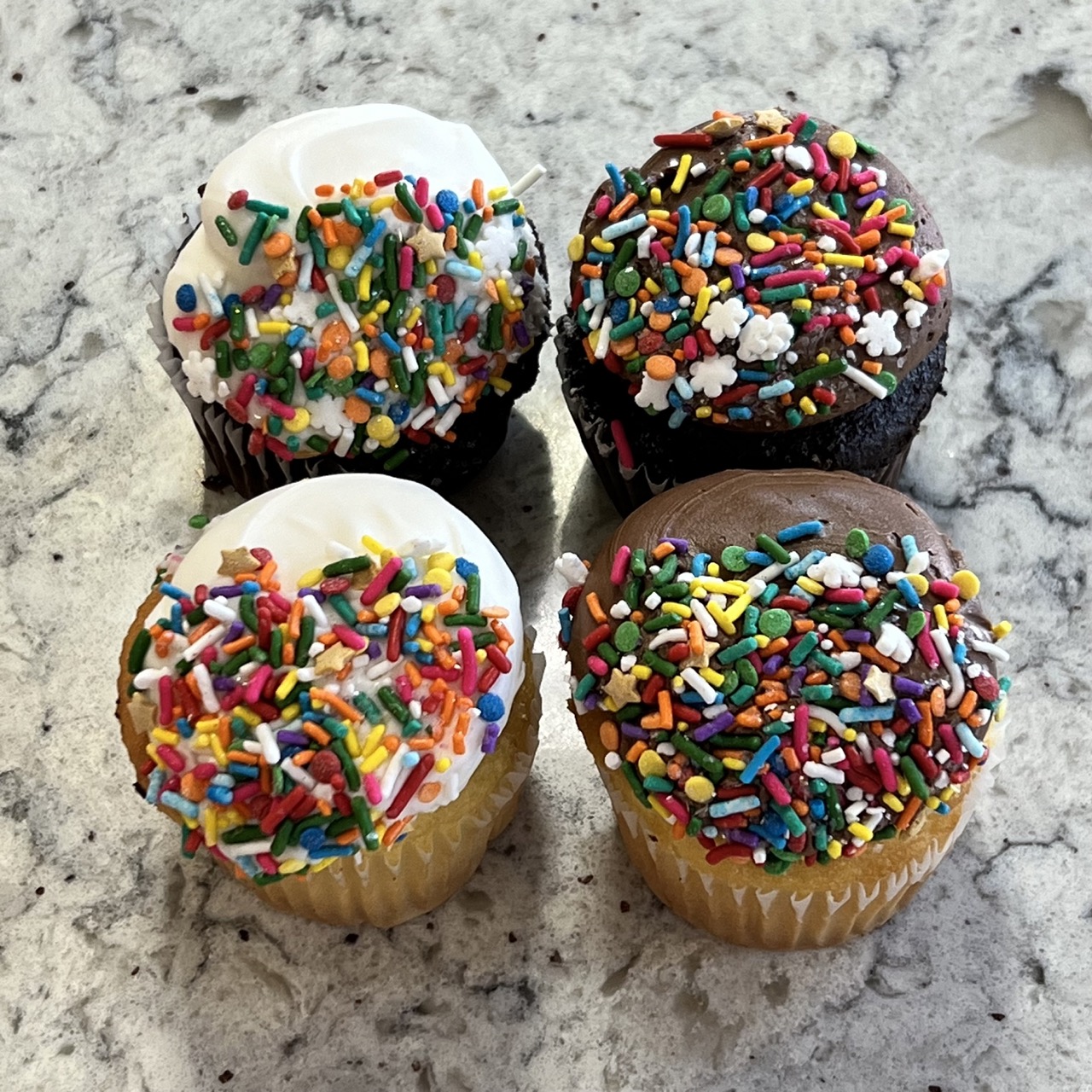 Available in yellow or chocolate cake, iced in buttercream (white or chocolate), and topped with assorted rainbow sprinkles.