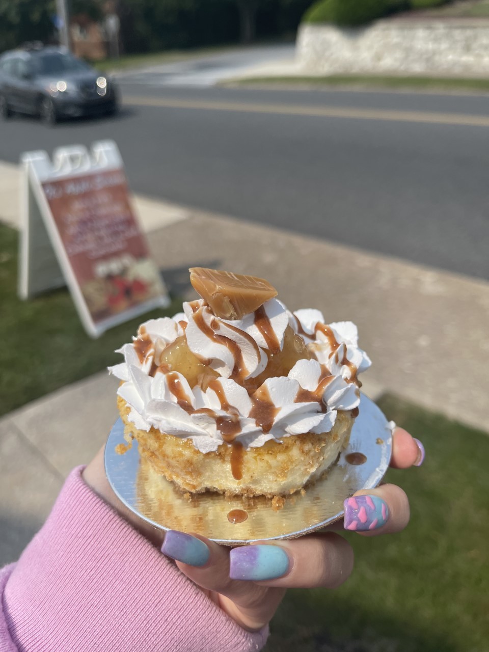 An individual plain cheesecake topped with apple filling, caramel whipped cream, a drizzle of caramel & a caramel candy.