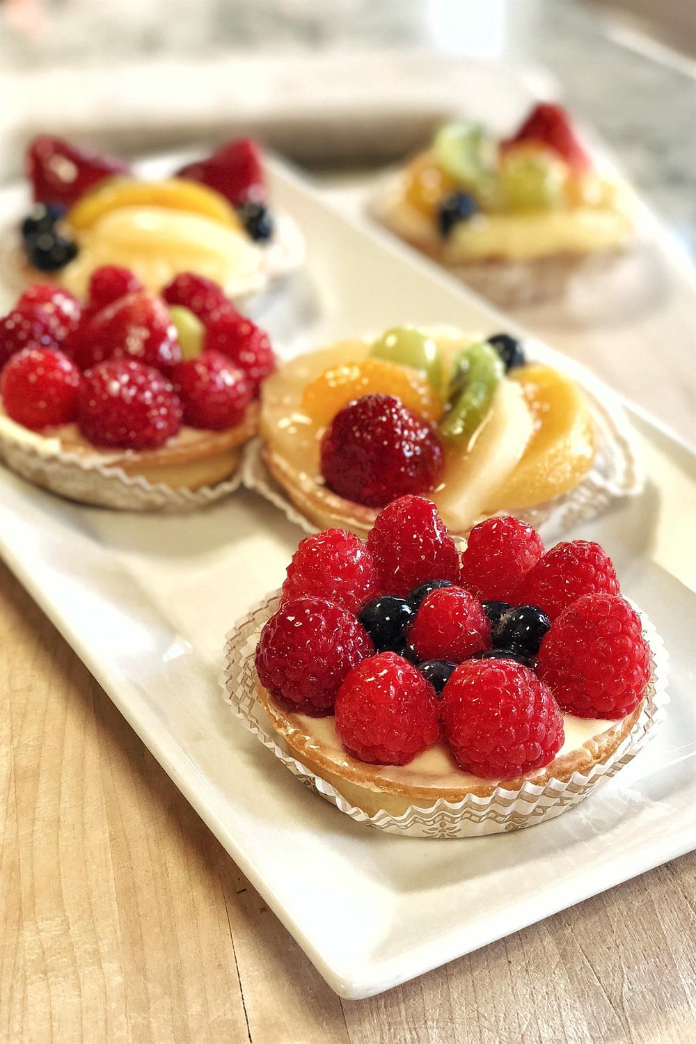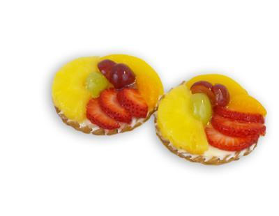 A 4" tart shell, filled with french custard, topped with assorted fresh fruits, and covered in a sweet apricot glaze.