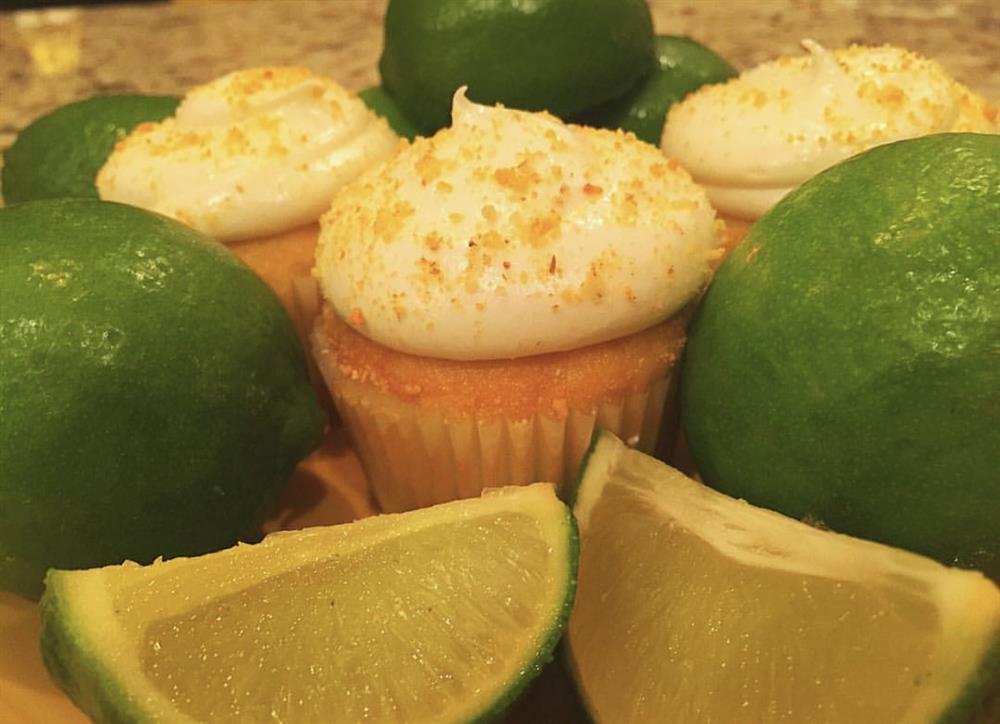 A vanilla cake filled with key lime filling, and topped with a cream cheese swirl and garnished with pie crumbs.
