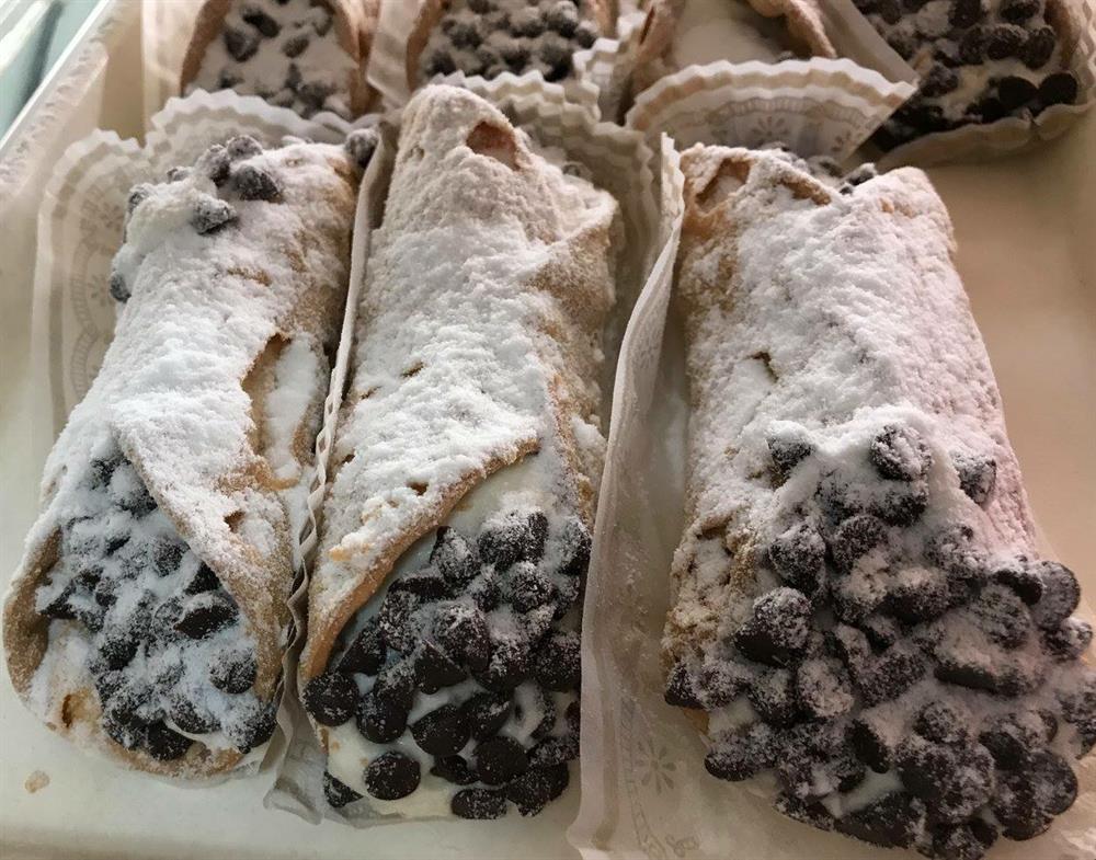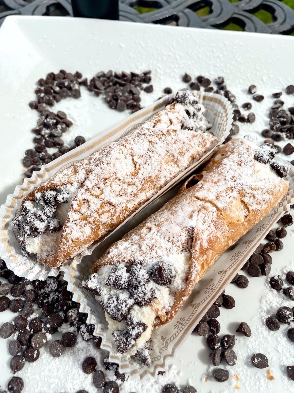 Our signature cannoli, with creamy ricotta cheese filling, chocolate chips, and sprinkled with powdered sugar.