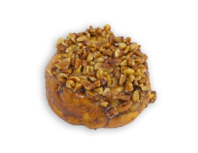 A delicious honey bun containing brown sugar and cinnamon, and coated with sticky smear and chopped pecans.