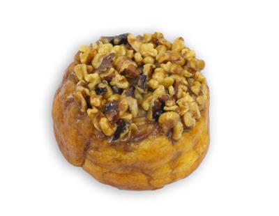 A delicious honey bun containing brown sugar and cinnamon, and coated with sticky smear and chopped walnuts.