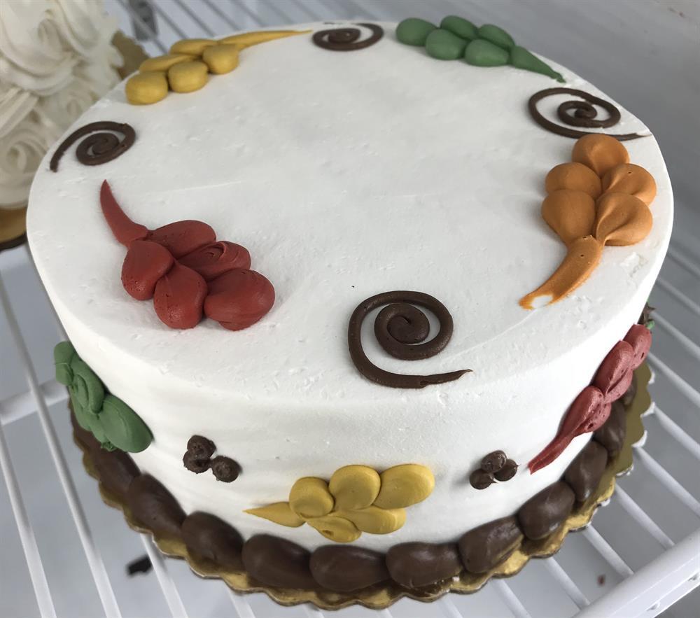An 8 inch cake, buttercream filled, and decorated with hand-piped leaves and chocolate swirls. Serves 8-10. When ordering, please specify cake flavor - including: yellow, chocolate, 1/2 and 1/2 (layer of yellow and layer of chocolate), or Marble.