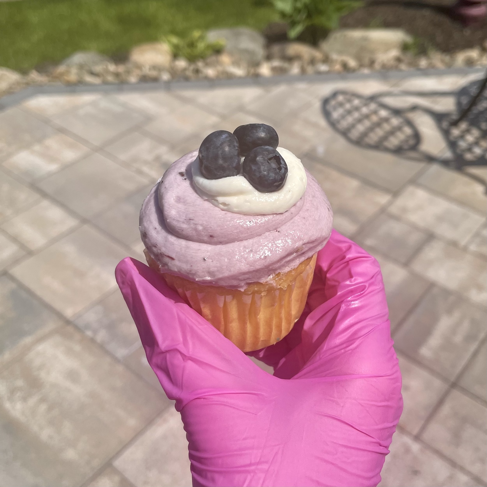 A lemon cupcake iced with a blueberry buttercream and topped with a dollop of blueberry filling. A delicious and refreshing summer flavor!