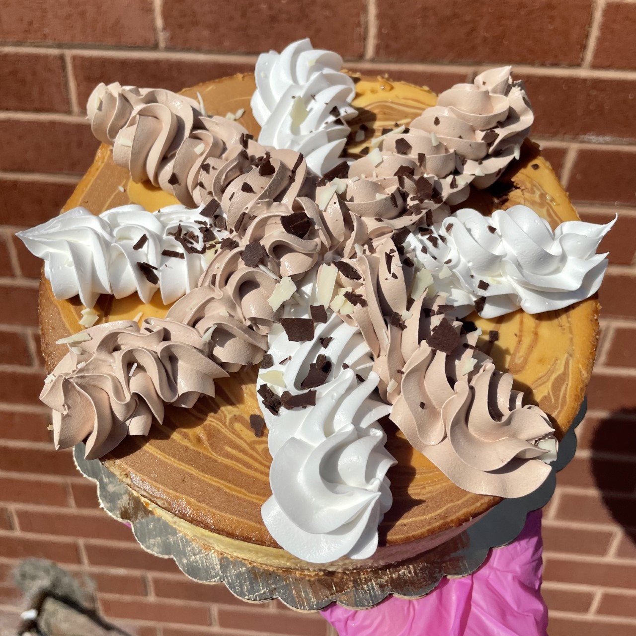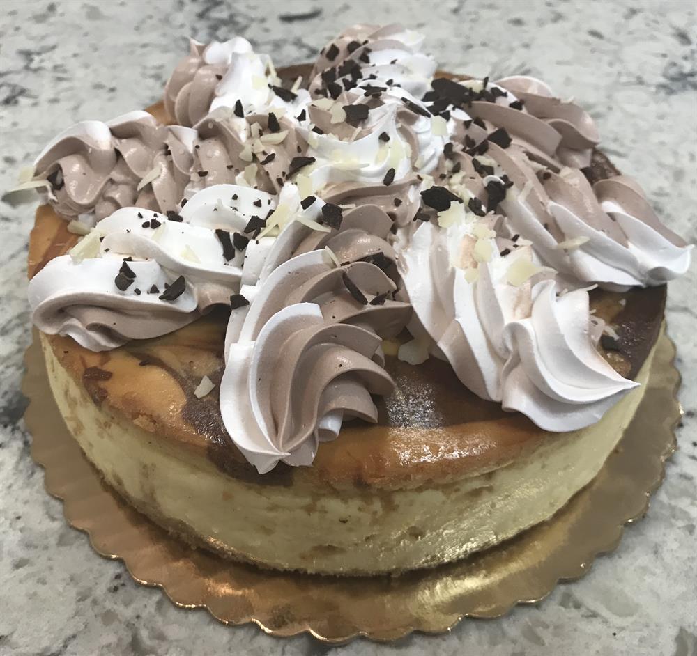 Our creamy New York style cheesecake with chocolate swirled throughout, topped with chocolate mousse and vanilla mousse and chocolate and white chocolate shavings.
