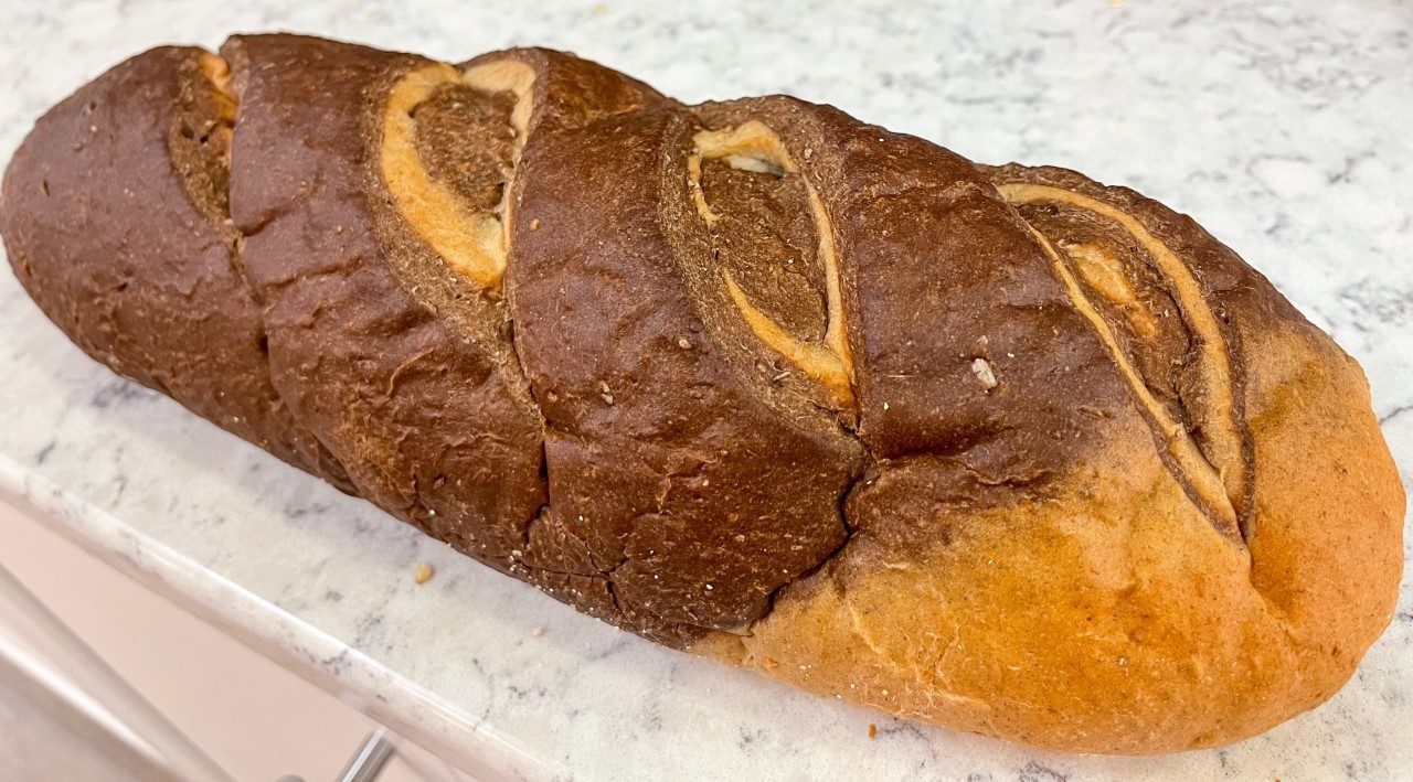 Both pumpernickel and rye bread swirled together in a beautiful loaf of bread.