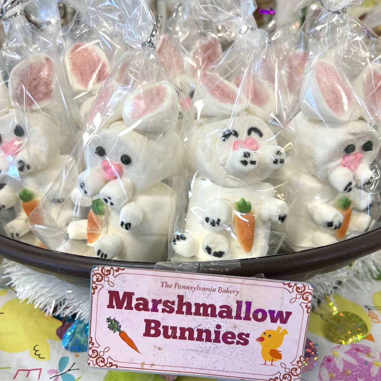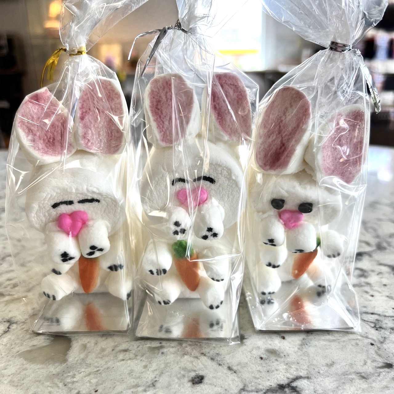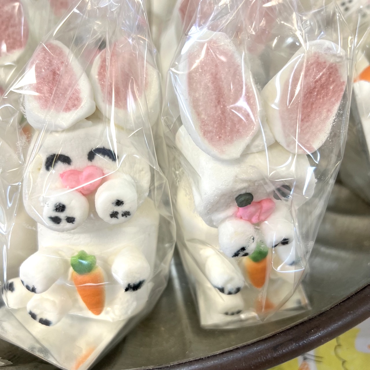 A customer favorite Easter basket treat! An Easter Bunny made completely of marshmallows and candy. Each individually wrapped and ribboned to place in Easter baskets.
