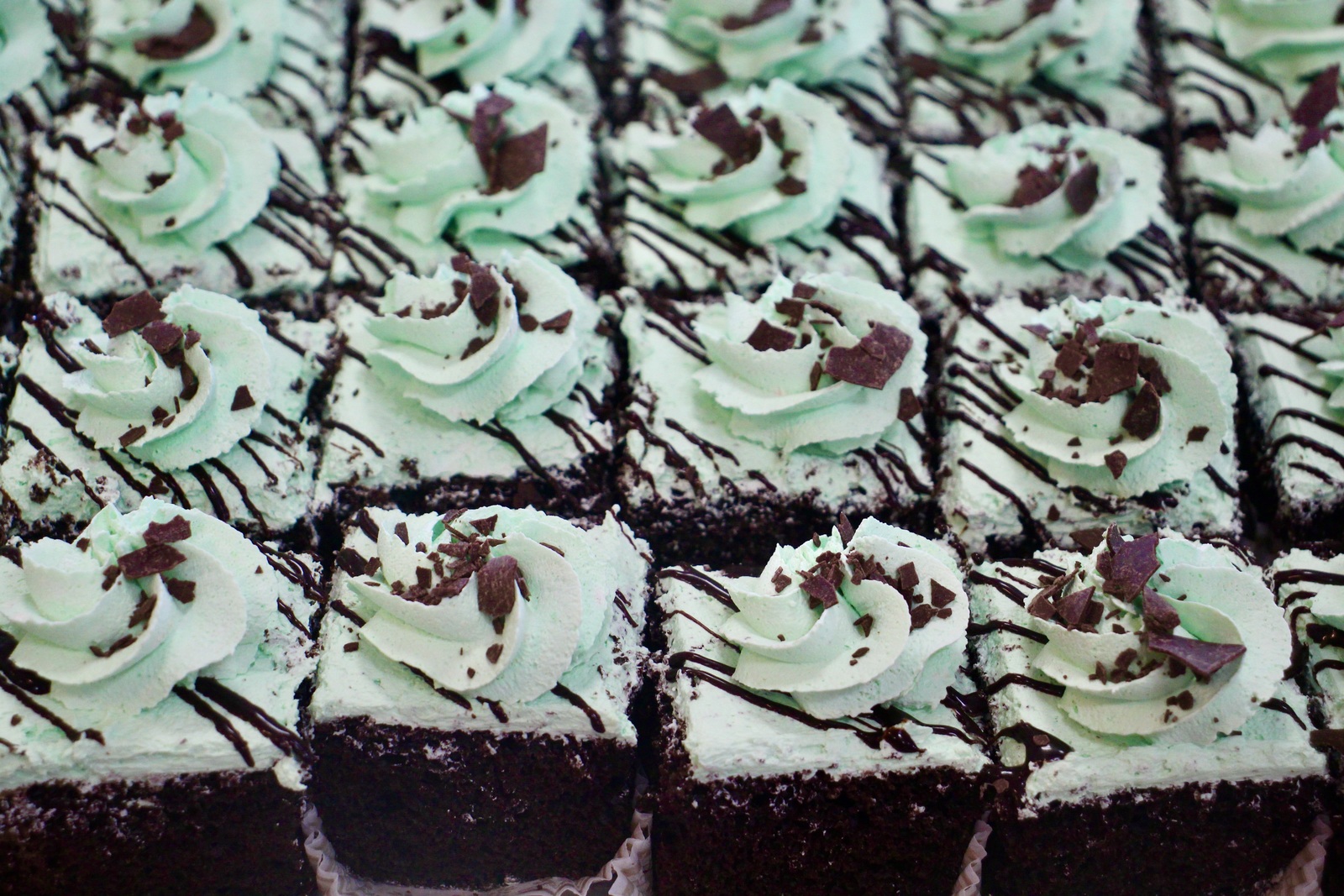 A layer of chocolate cake topped with a green-colored Bailey's Irish Cream Mousse and drizzled with chocolate ganache. A St. Patty's Day favorite mini dessert!
