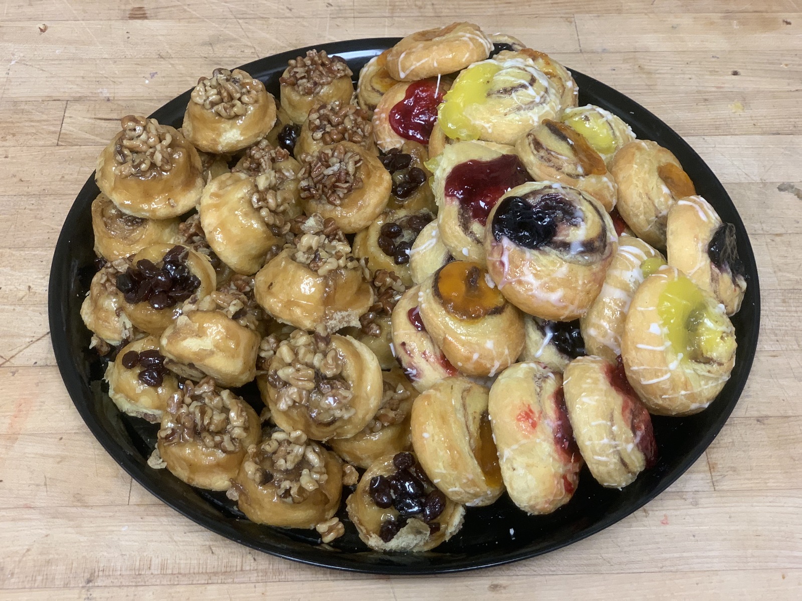 An assortment of 2 dozen of our assorted mini danish & 2 dozen of our assorted mini stickies, all served on a catering tray. Perfect bite-size little treats for any gathering.