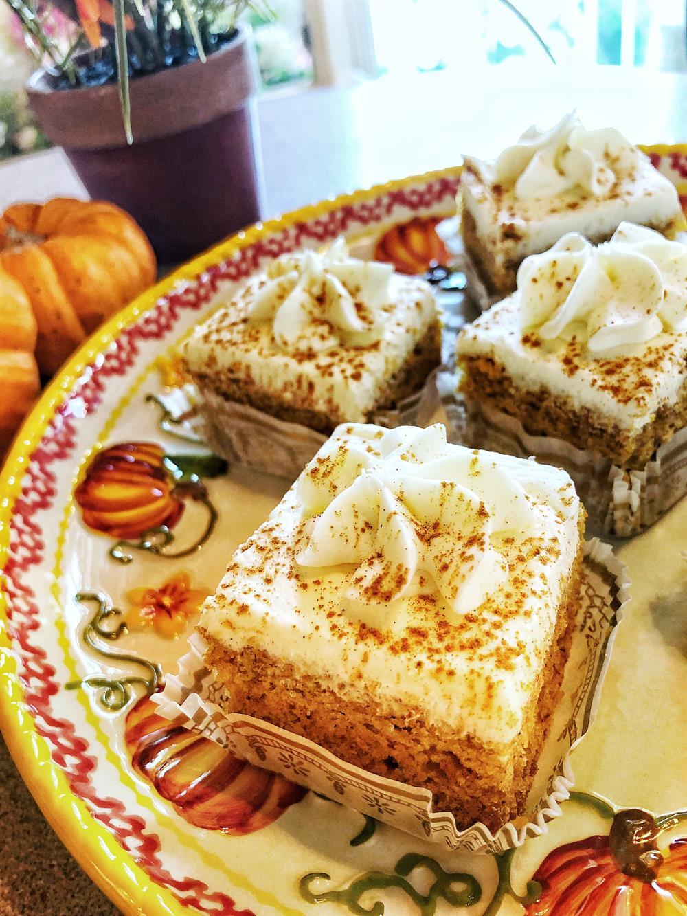 A layer of our delicious pumpkin spice cake iced with a cream cheese icing. Available during the fall season.