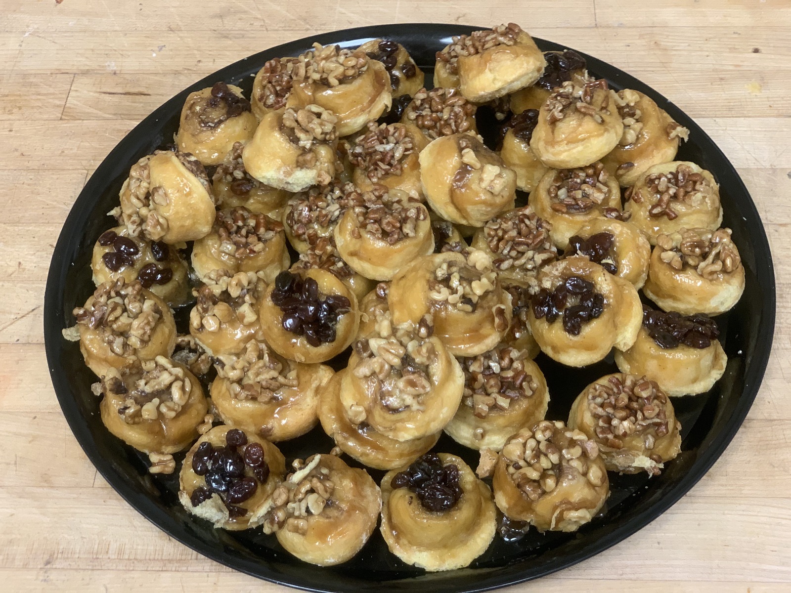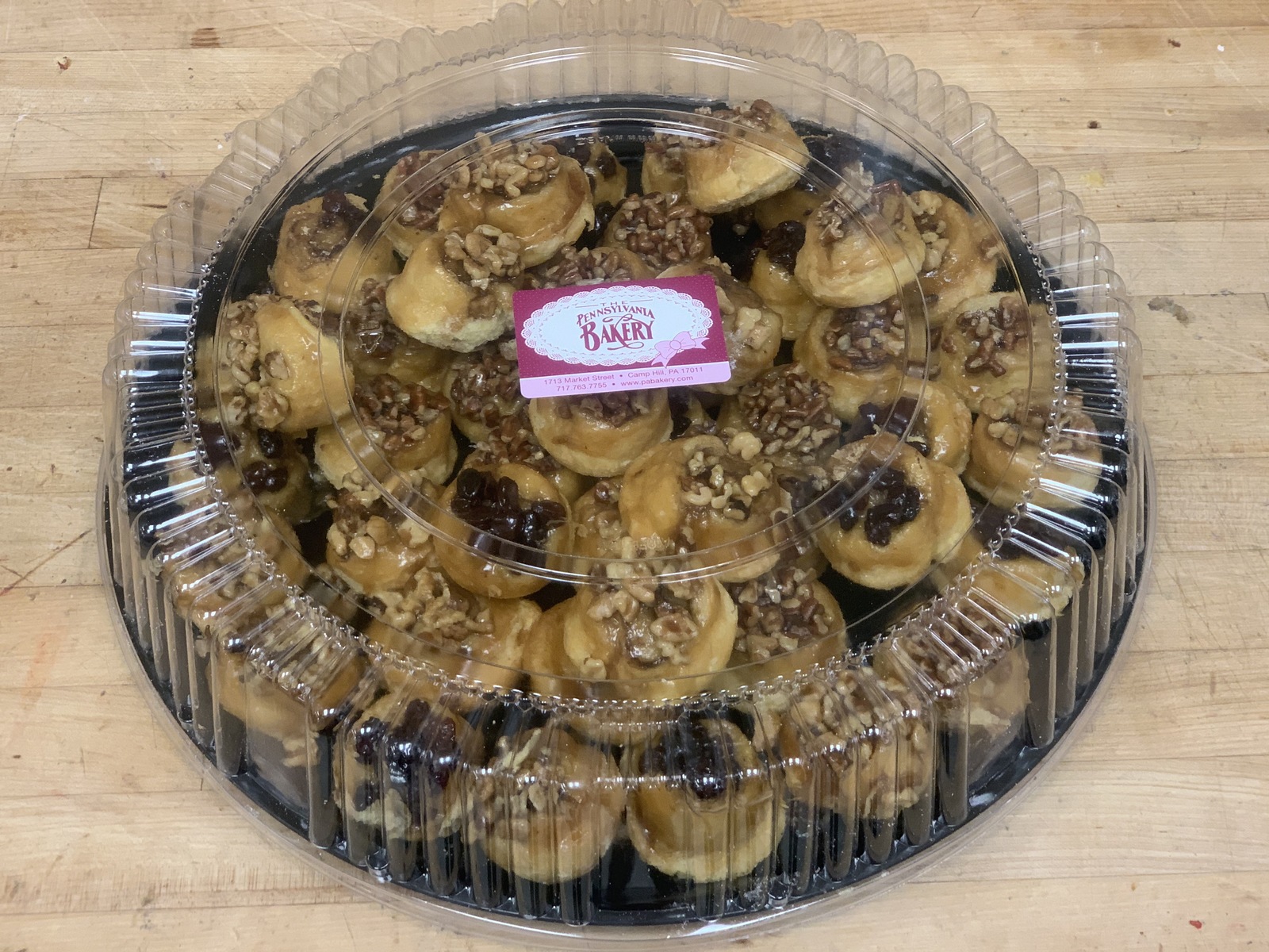 An assortment of 4 dozen of our mini stickies, all served on a catering tray. An assortment of plain, pecan, walnut, & raisin mini stickies. Perfect bite-size little treats for any gathering.