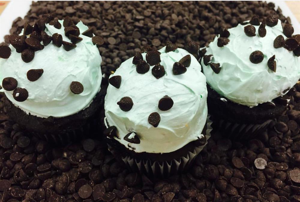 A moist chocolate cake topped with a mint mousse mixed and garnished with mini chocolate chips.