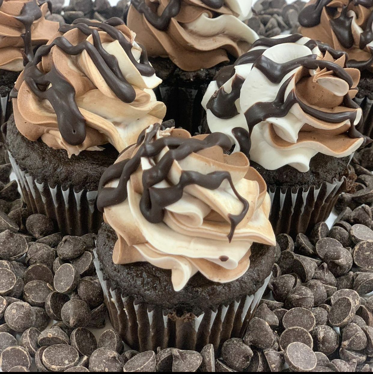 Our moist chocolate cupcake, filled with chocolate ganache, & topped with a swirl of vanilla & chocolate buttercream twist, & drizzled with chocolate ganache.