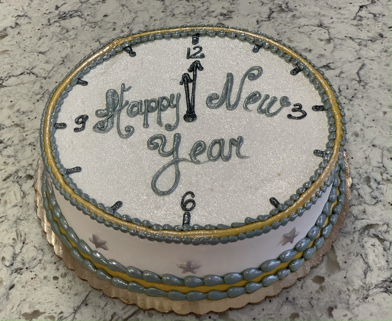A 7 inch cake (serves 6-8), iced in buttercream, and decorated with buttercream clock drawings. When ordering, please specify your flavor selection - including: yellow cake, chocolate cake, marble cake, or 1/2 and 1/2 (layer of chocolate and layer of yellow).